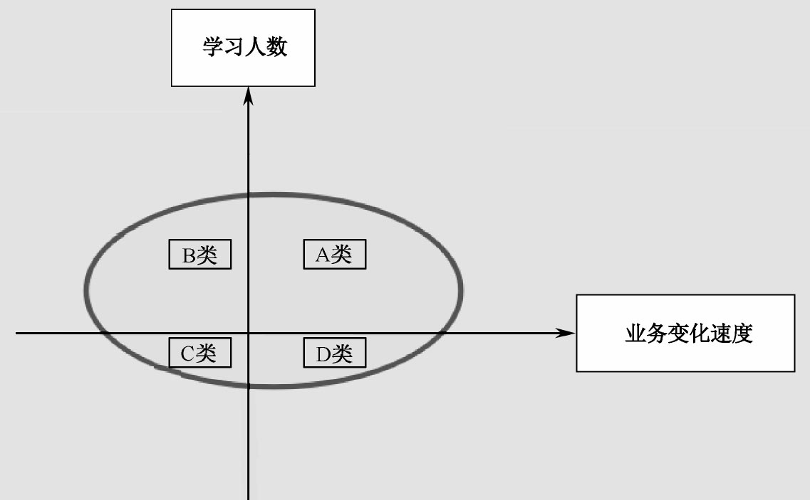 以学习人数和业务变化速度作为开发课程的标准,可分为以下四种情况。