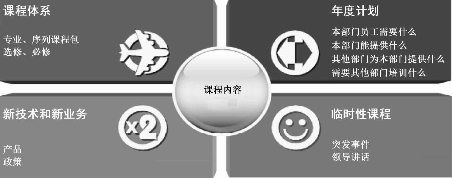 企业在线学习体系的建设是一个漫长的过程,建设的方向和内容需要随着实际情况不断变化。通常,开发在线学习内容时需要考虑以下四个方面的内容:课程体系、年度计划、临时性课程、新技术和新业务,如图6所示。