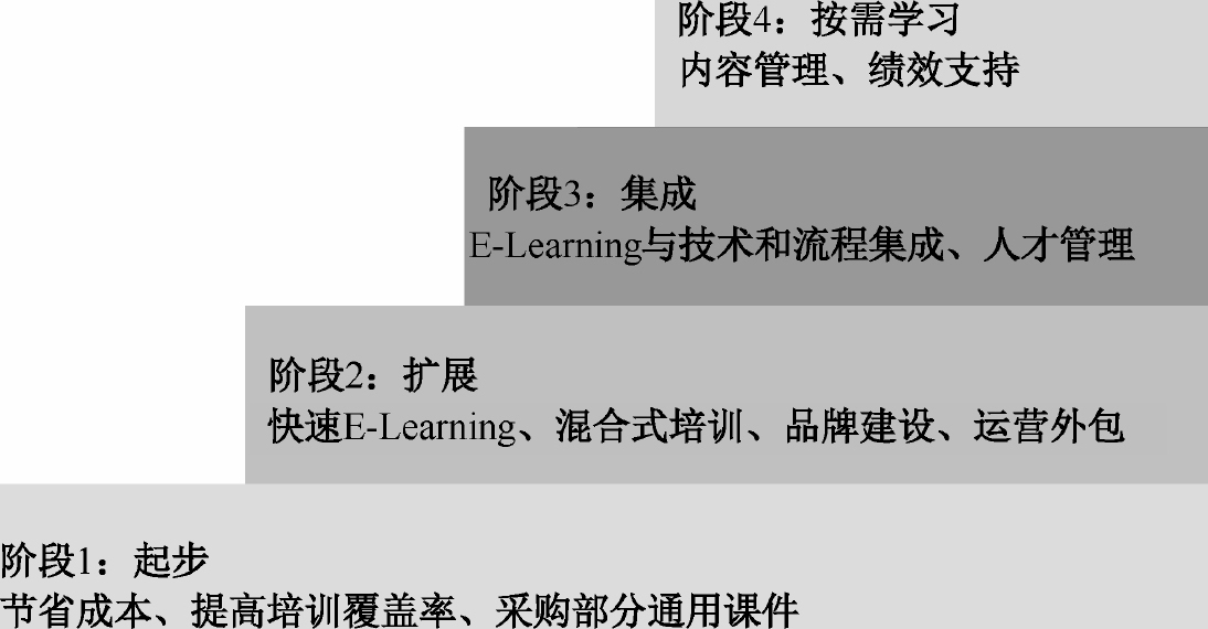 根据企业E-Learning成熟度模型(如图1所示),可以定位企业目前的在线培训需求。其中,起步阶段是企业在线培训发展的重点和难点,只有夯实基础,才能为企业搭建结实的培训大厦,为企业人才发展注入永恒的动力。