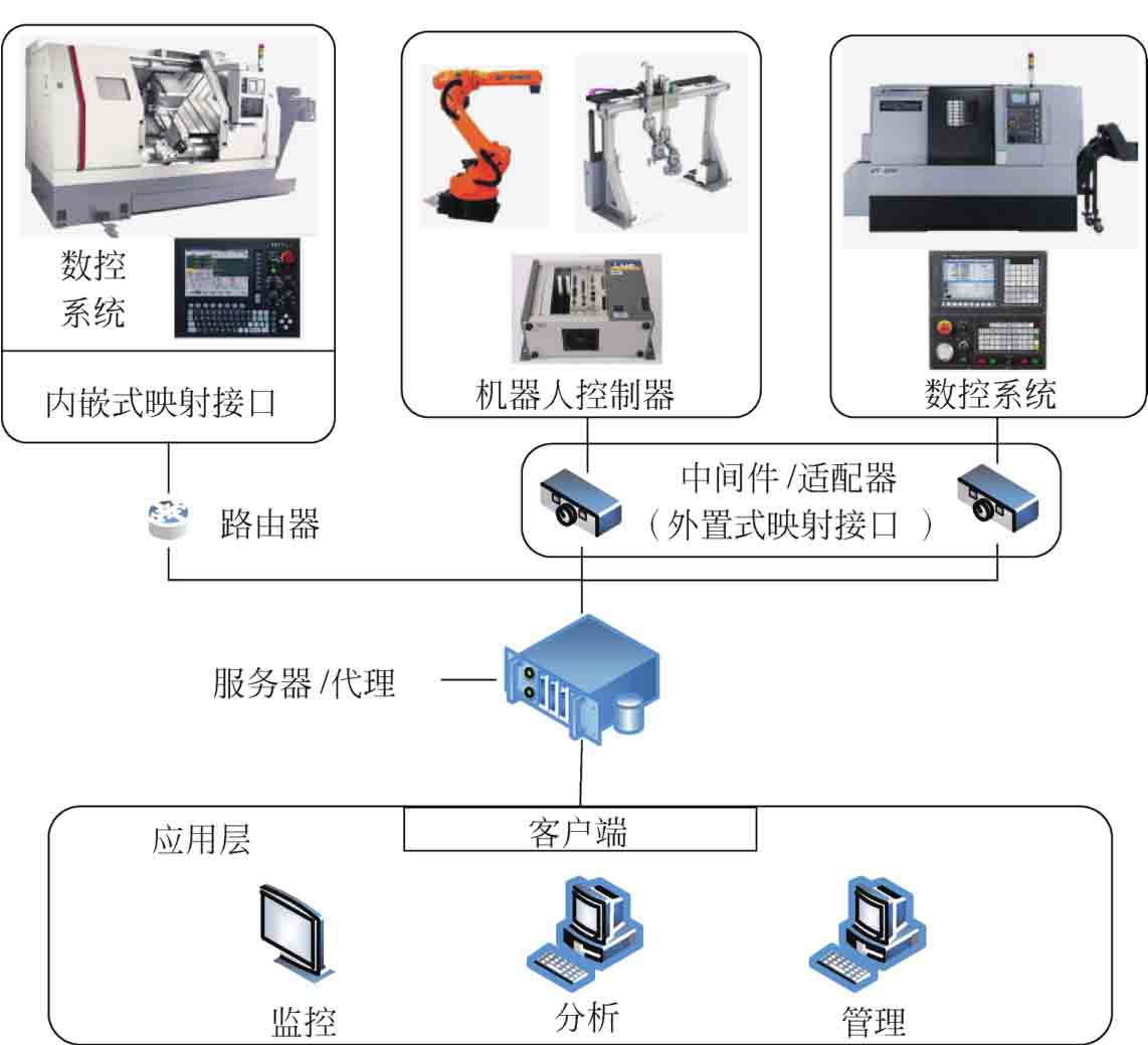 实现协议映射的方法是为设备和系统开发映射接口。当使用某种协议和方法为一个设备和系统建立信息模型后,可通过协议映射接口将其映射到其他协议,以实现与其他类型接口设备的互联互通。通过映射实现互联互通和信息集成的架构如图2-17所示。映射接口可以嵌入在设备自身数字控制器中,也可以作为一个额外的硬件和软件服务系统添加于设备外部,此时映射接口成为协议之间的转换适配器和中间件。