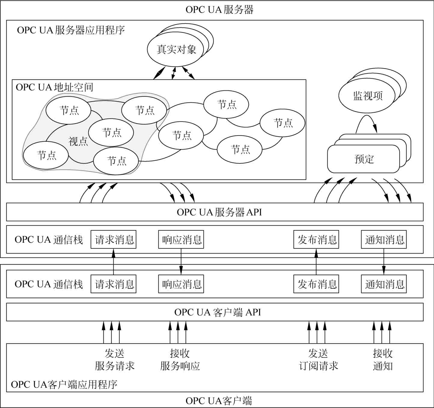 图2-16 OPC UA客户端与服务器之间交互的软件功能层次模型
