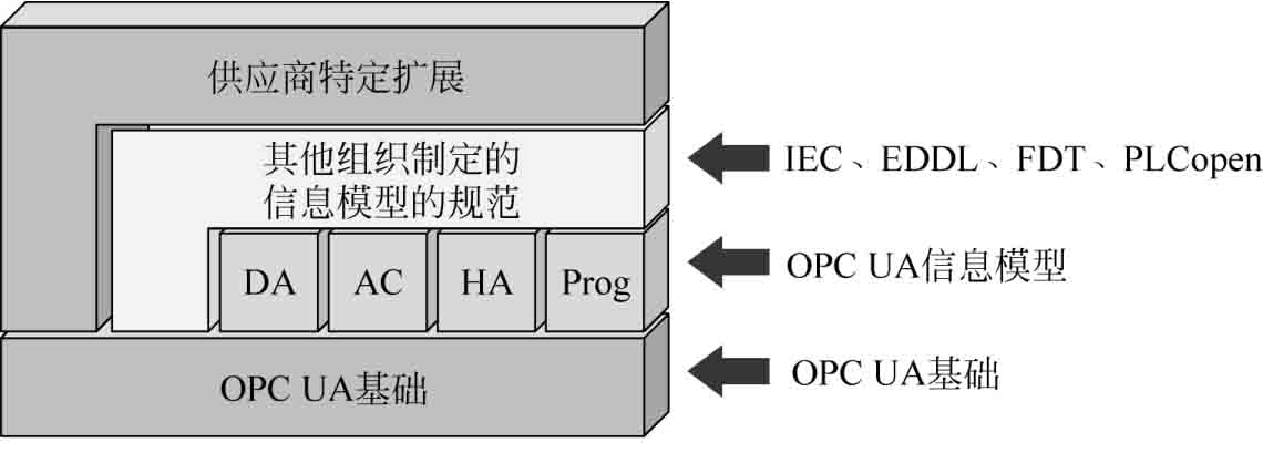 目前在设备信息模型建模方面存在多种方式和标准,如面向机电设备的开放式数控系统标准,面向电子设备的电子设备描述语言EDDL,统一建模语言UML以及OPC UA提供的建模规范等。当前各类已定义的建模方法和语言大多针对某一类特定的装备,如EDDL面向电子设备,MTConnect面向数控机床,目前尚缺乏统一的、成熟的、能广泛适用于不同类型装备的信息模型建模方法。国际上和国内均在为解决此问题提供不同的解决方案。国际上,OPC基金会与各类组织合作,将各类组织的信息模型与OPC UA的信息模型架构建立连接和转换关系,使得可以在OPC UA中使用各类已定义的设备信息模型,并使其符合OPC UA地址空间的结构、引用关系和数据类型等要求,在OPC UA架构下实现不同设备的信息模型。图2-15显示了OPC UA信息模型的层次框架。国内方面,在国家智能制造专项的支持下,由机械工业仪器仪表综合技术经济研究所牵头制定了《数字化车间制造装备集成与互联互通》系列标准 [27] ,为数字化装备定义了统一的信息模型建模方法和规则,并对典型装备数控机床和机器人给出了具体的信息模型示例。国家机床质量监督检验中心和清华大学等则制定了《数字化车间 机床制造 信息模型》标准 [28] ,为机械加工数字化车间提供了信息建模规范。