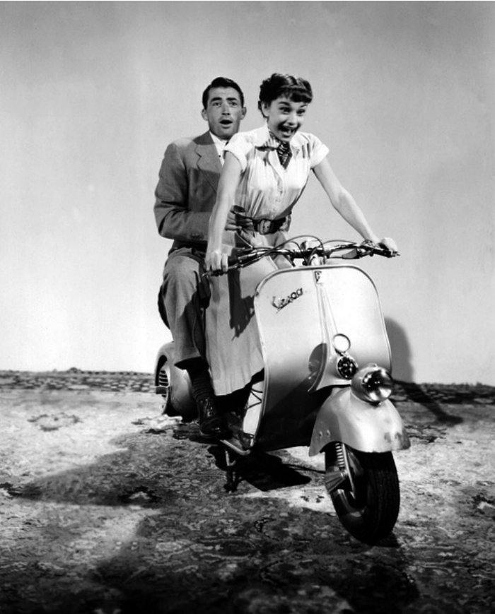 意大利在历史上是一个工业制造业和旅游业都很发达的国家,它的摩托车制造也很发达。1953年上映的电影《罗马假日》曾风靡全球,浪漫的故事、美丽的罗马风光、美丽迷人的女明星奥黛丽·赫本(Audrey Hepburn),使得这部电影获得了巨大的成功。对于意大利摩托车品牌有一些了解的观众会发现,在电影中载着男女主角穿梭在罗马大街小巷的那辆摩托车(见图5-1),就是当时意大利摩托车的著名品牌“Vespa”,中文翻译名称为“维斯帕”,在意大利语中意思是“黄蜂”。象征生性烂漫、恣情不羁的意大利人精神的Vespa摩托车,在给《罗马假日》增添意大利独有风情的同时,也被这部影片推向了世界。