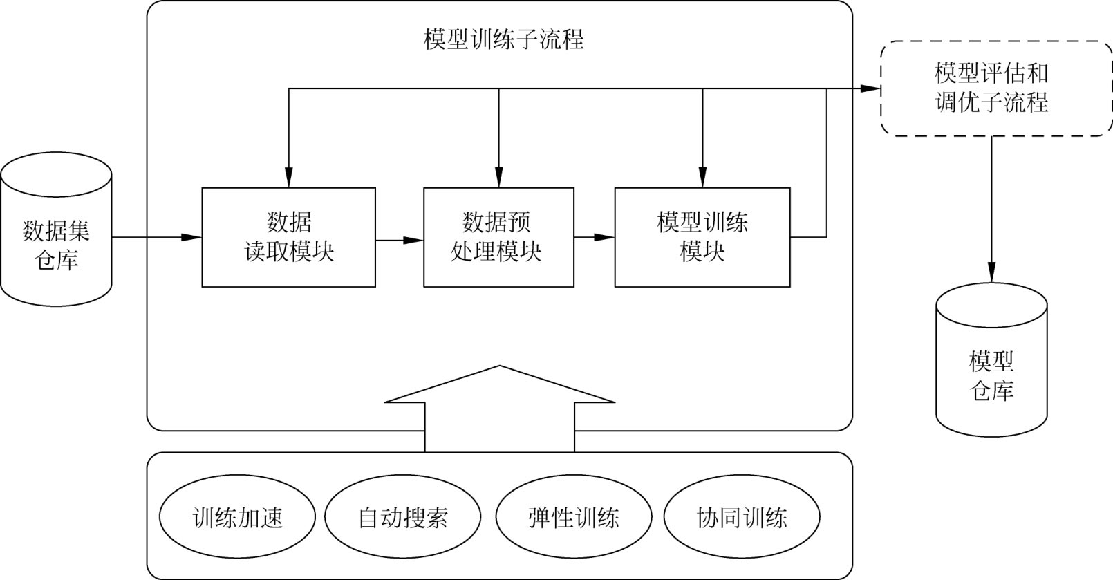 为了提升模型性能,模型训练子流程内部的多个模块(数据读取模块、数据预处理模块、模型训练模块)需要被流水线并行起来,并且采用一些其他加速方法,如混合精度、图编译优化、分布式并行加速、调参优化等。除训练加速外,还有一个核心痛点是模型调优。为了减少基于经验的人工调优,可以使用模型评估和调优子流程,根据机器诊断建议进行调优,也可以将该调优流程自动化。另外,在公有云上可以通过弹性训练、协同训练来实现模型训练成本的进一步降低。这些核心能力将在第6章中具体介绍。