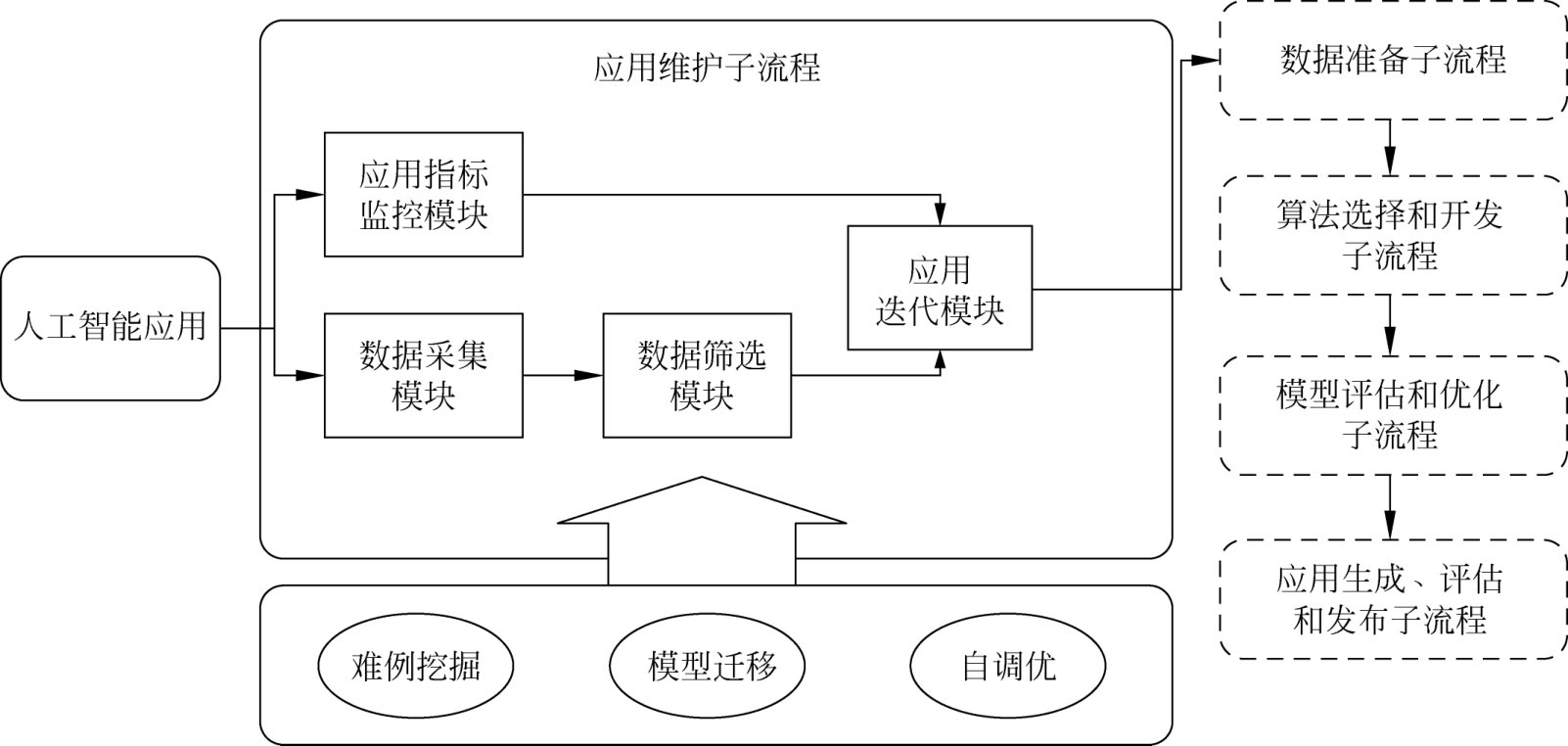 总体上,人工智能应用开发的过程就是不断进行数据和模型的处理,并且最终生成满足预期的人工智能应用的过程。当人工智能应用部署后又需要及时维护以保证其能够正常使用。
