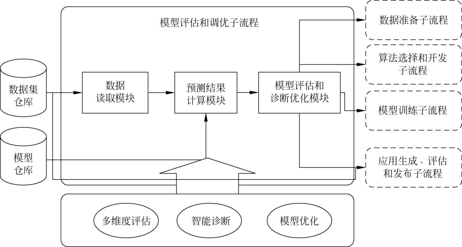 模型评估模块针对模型预测结果与真实结果之间的差异,输出一系列不同维度下模型表现的效果,便于开发者分析。当模型的某些指标没有达到期望时,开发者往往需要深入理解并定位其原因。由于算法和模型的复杂性,开发者通常需要具备非常高的技能才可以找到原因。因此,人工智能应用开发平台提供模型诊断功能,针对模型的每个指标,通过一系列工具链自动分析来辅助模型诊断过程。开发者根据平台反馈的诊断建议可进行进一步的模型调优。二次调优会涉及数据准备的调优、算法的重新选择或开发,以及模型的重新训练,因此模型评估和诊断模块后续可能会分别对接这些子流程。如果模型的全部指标都达到期望,则可以进入应用生成、评估和发布子流程。