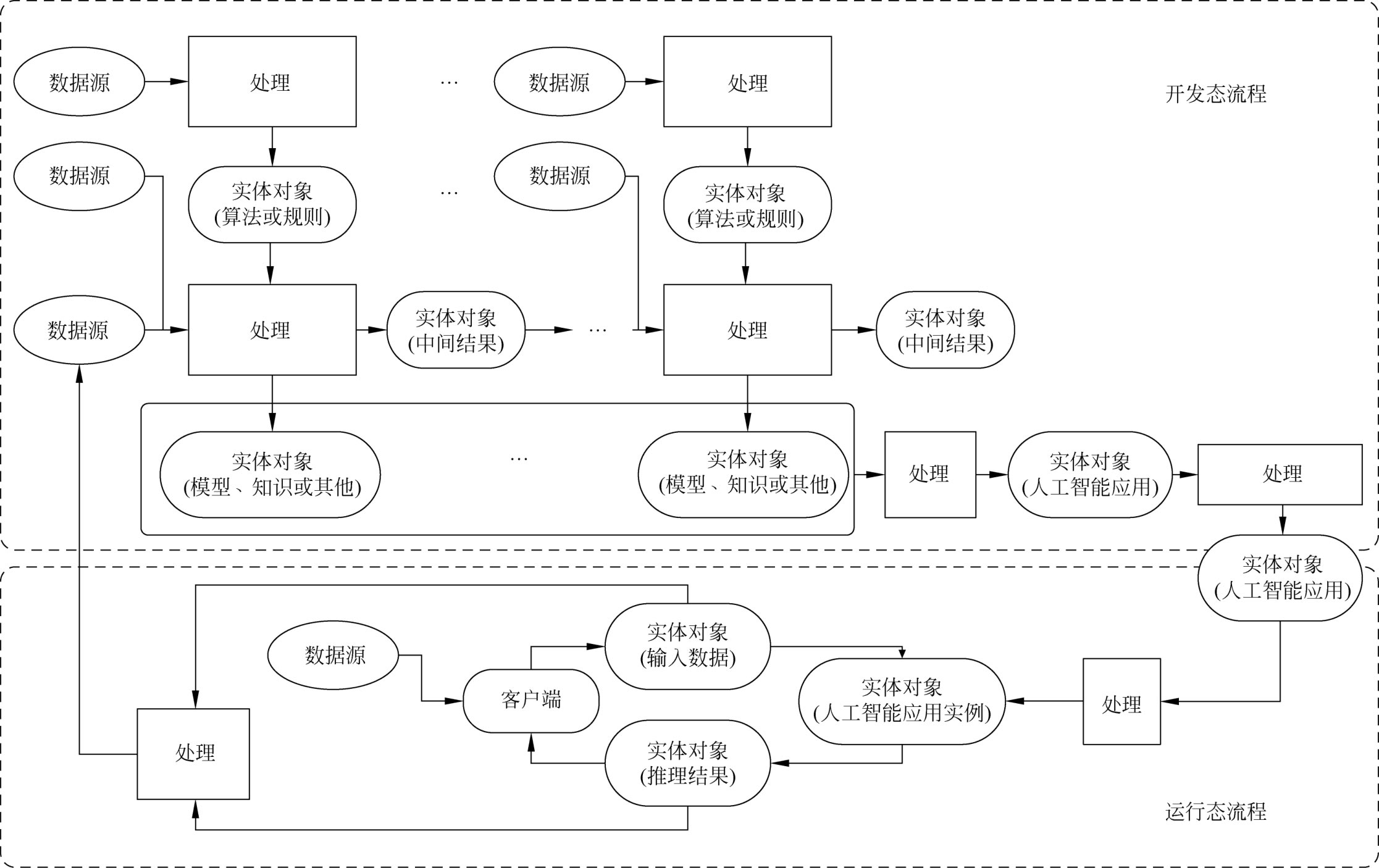 人工智能应用开发的全流程大致包括开发态流程和运行态流程。开发态流程是对数据源不断地进行处理并得到人工智能应用的过程;而运行态流程相对简单,主要是将人工智能应用部署起来使用的过程。当人工智能应用在运行态推理效果不好时,需要将推理数据返回给开发态进行进一步迭代调优。