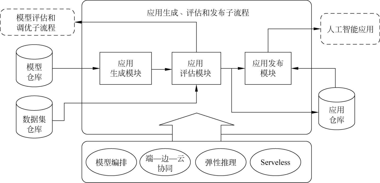 应用生成、评估和发布子流程如图3-8所示。一个复杂的人工智能应用通常包括多个模型及其他配置文件或脚本。当所有的模型都评估并且调优之后,需要对这些模型进行编排和优化,才可以形成一个完整人工智能应用。因此,本子流程中第一个模块就是应用生成模块。