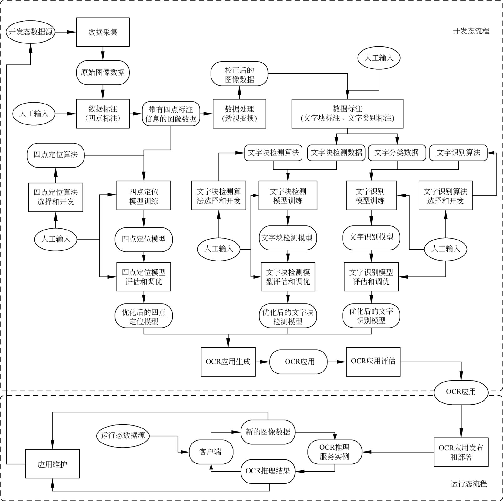 以某证件类OCR开发全流程为例,上述人工智能应用开发全流程如图3-2所示。可以看出,该流程基本满足图3-1中的各类抽象。在该OCR开发全流程中,需要通过数据采集模块获取原始数据(即证件类的原始图像),考虑到证件类图像中证件位置可能倾斜,因此需要首先对证件的四个顶点进行标注然后再进行数据处理,将图像中证件位置矫正。紧接着,一方面,可以继续标注证件图像中文字框和文字类别,用于文字框检测和文字识别模型的训练;另一方面,可以根据证件四个顶点的标注信息训练四点标注模型。当这三个模型(矫正、文字框检测和文字识别模型)分别训练完成后,可以通过编排生成一个OCR应用,并经过评估之后部署起来使用。在运行态如果有推理不好的数据,则需要通过应用维护模块将其返回开发态进行进一步迭代和优化。在该流程中,数据源包括开发态数据源、运行态数据源、人工输入(如算法编写、数据标注信息、训练超参配置、模型评估检查等输入信息);处理包括数据采集、数据标注、数据处理、算法选择和开发、模型训练、模型评估和调优、应用生成、应用评估、应用发布和部署、应用维护;实体对象包括数据集、算法、模型、最终生成的应用。