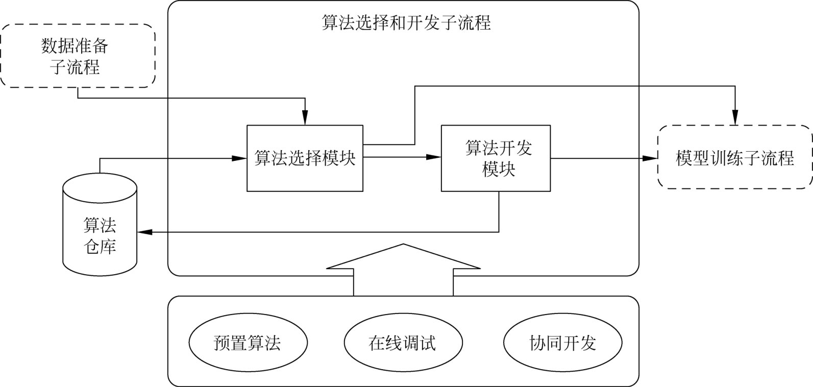1.1.2节介绍了几种不同的人工智能技术领域及其所涉及的经典算法。对于每个领域而言,每年都不断有新的算法出现,尤其是深度学习领域,新算法出现的频率更高。如图3-5所示,开发者需要根据数据准备子流程中数据的情况、所要完成的任务及其业务场景来综合考虑如何选择最合适的算法。人工智能应用开发平台内置的很多主流算法库可以被直接订阅使用,这大大简化了人工智能应用开发者的工作量。当然,开发者也可以根据具体需求对某个算法进行深入分析,并自行开发。