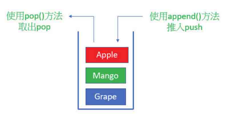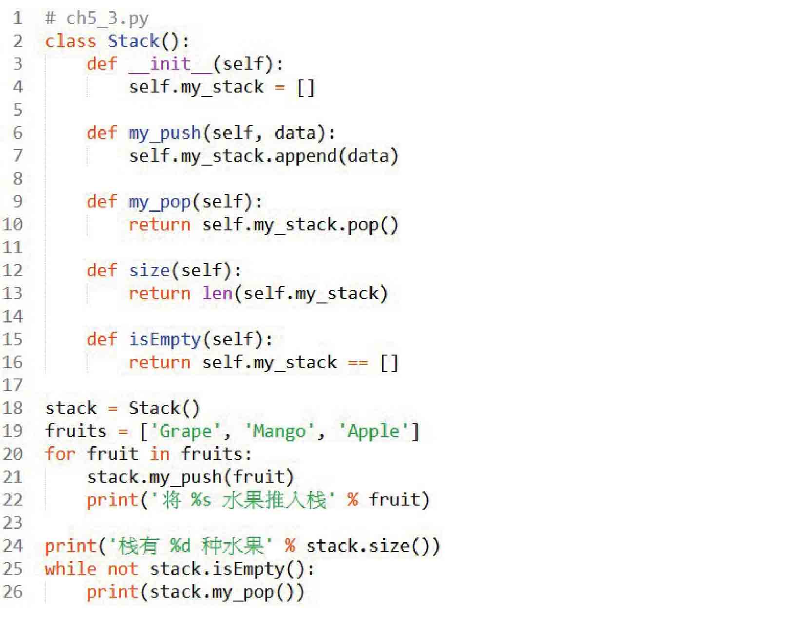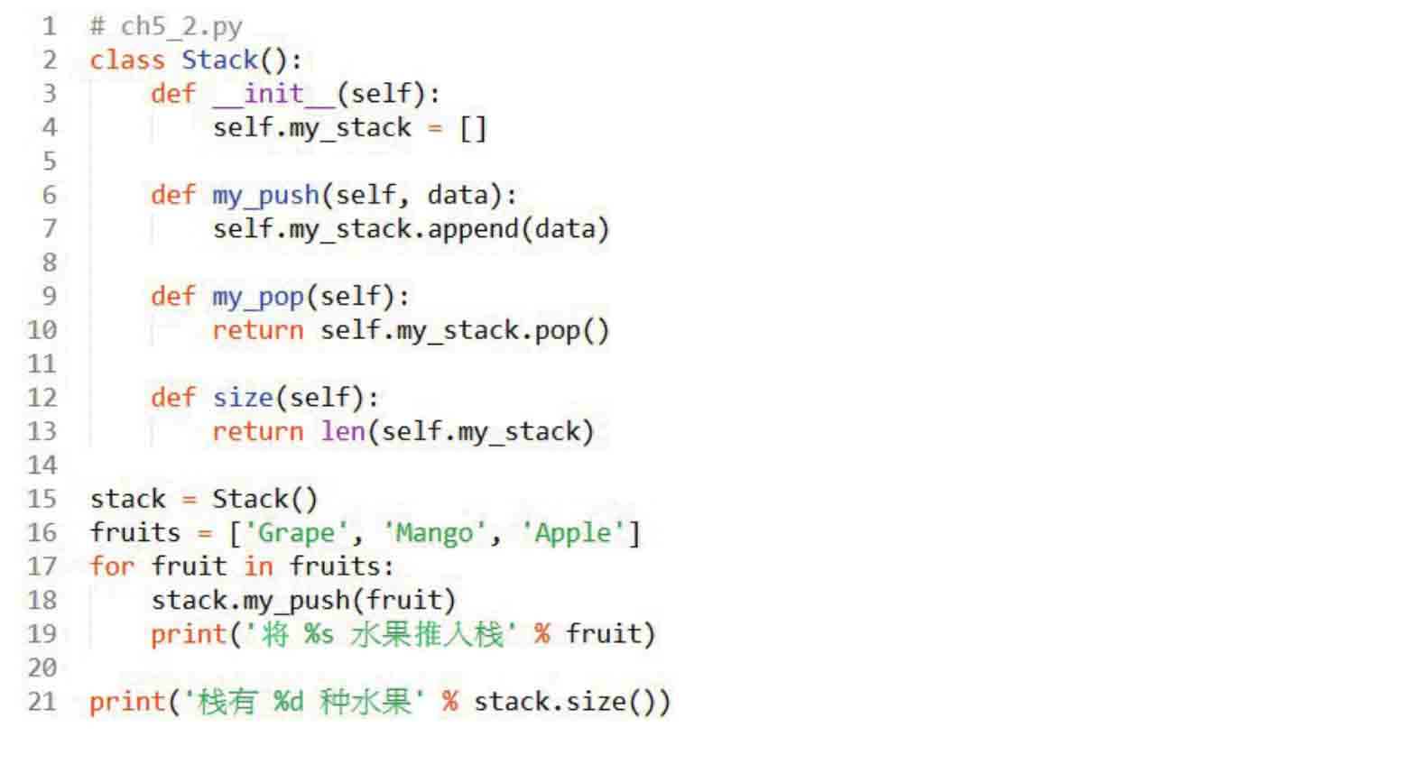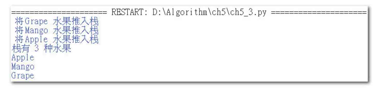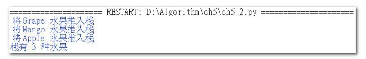 程序实例ch5_2.py: 将Grape、Mango、Apple分别推入栈,然后输出有多少种水果在栈内。