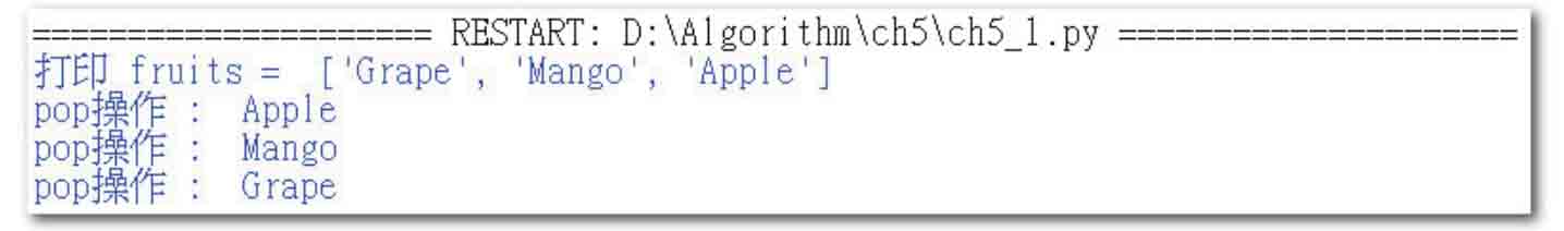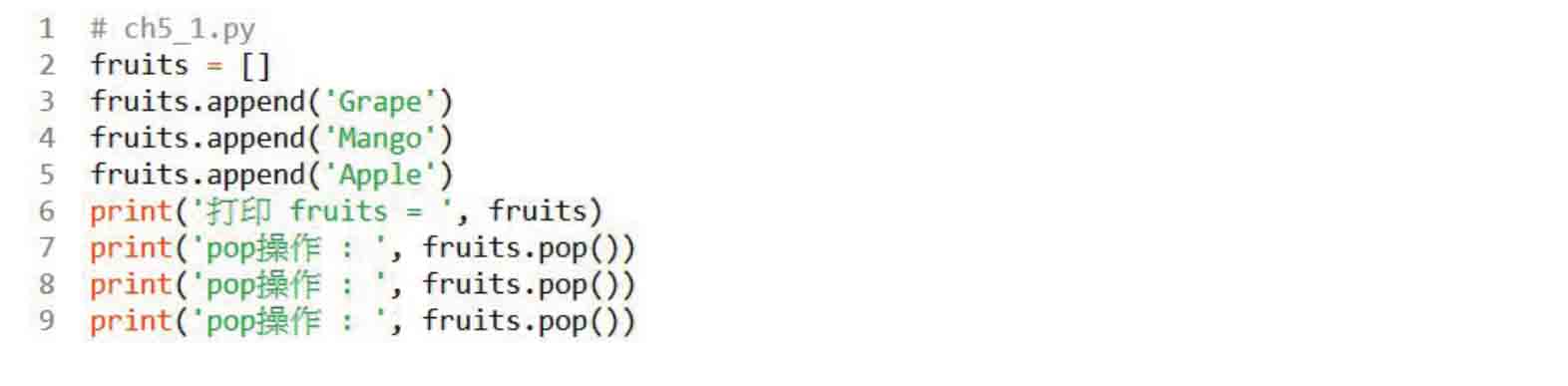 程序实例ch5_1.py: 使用Python的append( )模拟栈的push,使用Python的pop( )模拟栈的pop。
