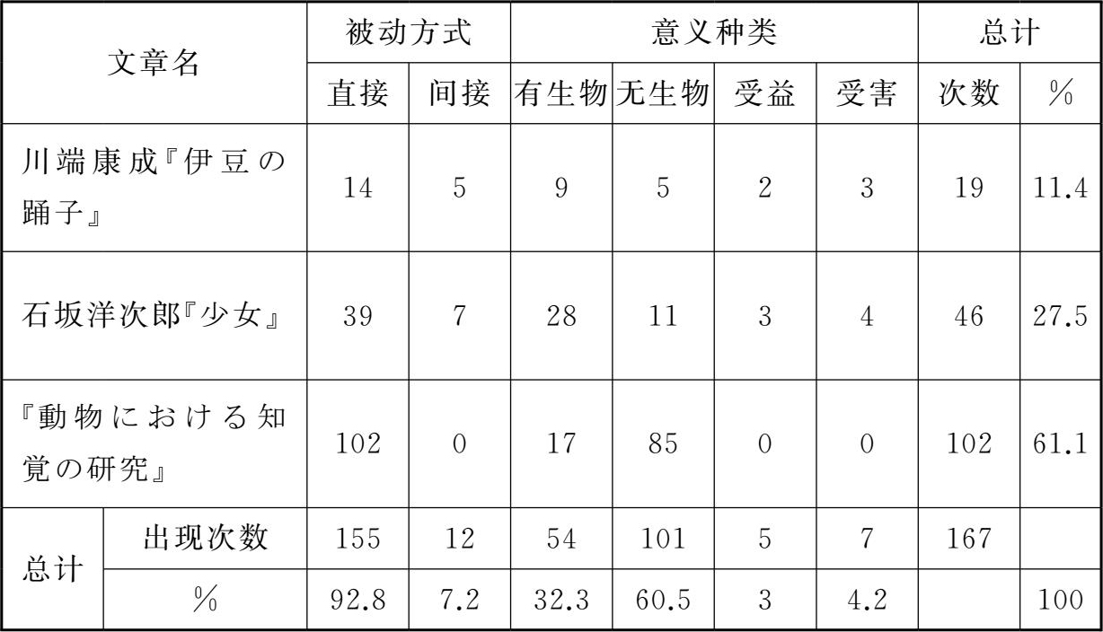 山东大学日语专业学生王勇刚在毕业论文中对三篇字数相近的日语文章中被动态的形式及意义进行了调查统计,得到如下有益的结果: