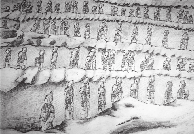 后来,你们被士兵们送进了陪葬坑,沉淀着历史的黄土束缚着你们的躯体。地下黑得什么也看不见,四周一片寂静,你们安静地待在下面,就此被永久固定。你们厌恶,你们生气,你们想重见光明。你们应该表达出来,但你们不说话。