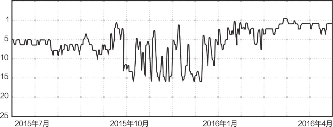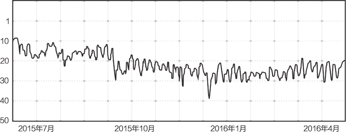 图1.9~图1.12是从App Annie中获取的几个受欢迎App的下载数量历史排名。将这一排名与同类别其他App进行比较,可以判断App的受欢迎程度。图中的排名变化,可以表明它是否处在上升阶段。
