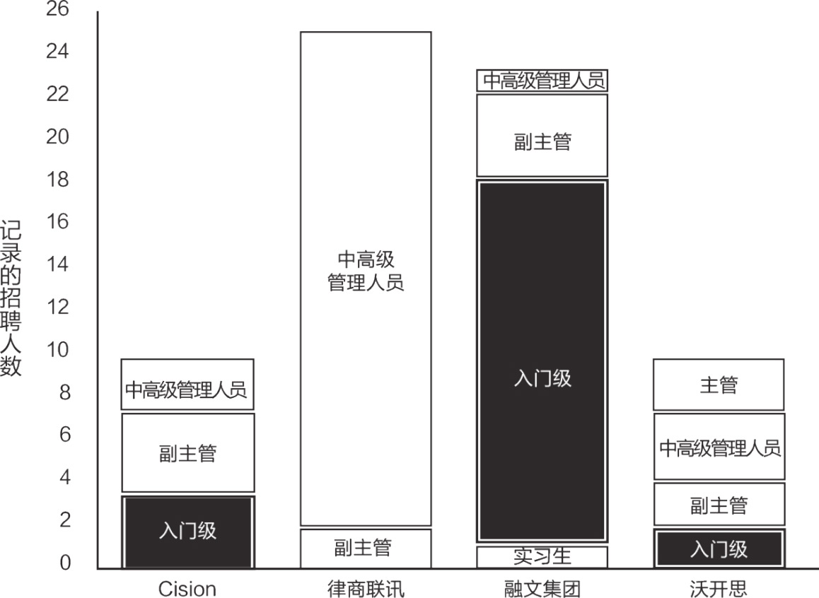 分析招聘广告中对求职者工作经验的要求,又可以发现更多差异。沃开思和Cision两家公司较为平均地招聘拥有不同工作经验的职员。融文集团主要招聘入门级职员,而律商联讯几乎只招聘中高级管理人员。将律商联讯重点招聘中高级管理人员的数据与它们在产品研发上的投资的数据结合起来,可以看出它们正在经历变革。后来我们也证实了,律商联讯当时正在研发一个具有战略意义且覆盖全公司的新技术平台,为其未来的内容生产提供强大动力(见图1.3)。