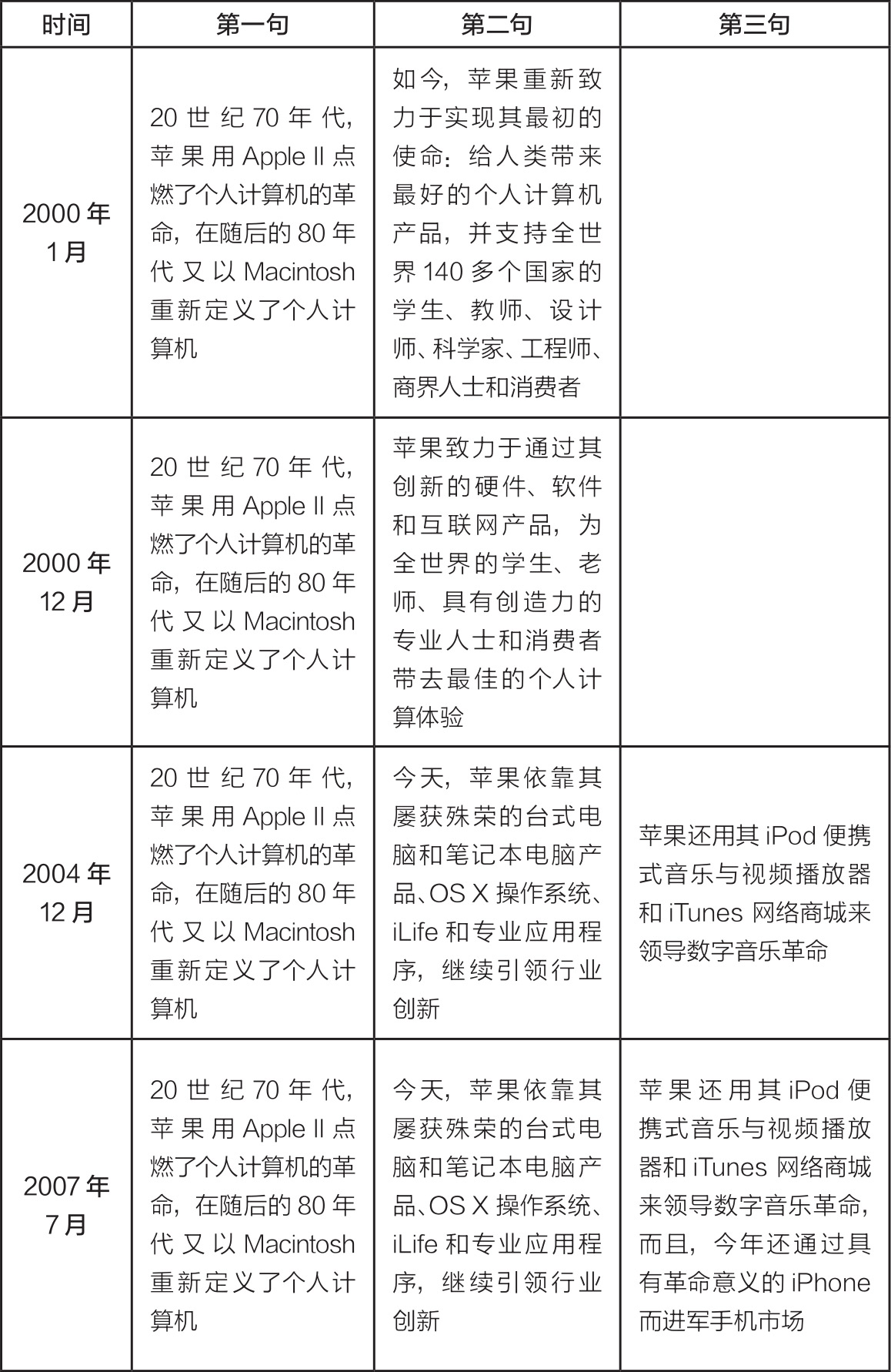 苹果仍然紧紧抓住以前的荣誉不放,但在描述当前的状况时,其措辞明显变得更加大胆。值得注意的是,公司首次引入第三句话来着重描述iPod。而当时这个产品实际上已经推出了3年之久。在这以后,苹果在提到其新产品时,信心要比以前强得多。