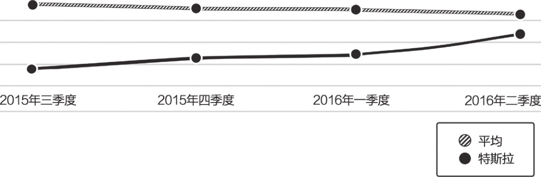 各公司通过网站展现希望给外界留下的印象。借助社交媒体,它们能够直接听到客户的声音,也可以实时了解公司用户在产品、客服等方面的满意度。图1.4展示了特斯拉(Tesla)与对标的同行业其他品牌汽车制造商,包括梅赛德斯-奔驰(Mercedes-Benz)、宝马(BMW)和奥迪(Audi)等,随着时间的变化的客户满意度情况。客户满意度是用网友在各公司脸书页面上表达的情绪来反映的。有意思的是,尽管特斯拉在各种媒体上频繁亮相,但客户满意度仍然落后。但其变化趋势向好,到2016年二季度,特斯拉的数值已经很接近其他汽车品牌。
