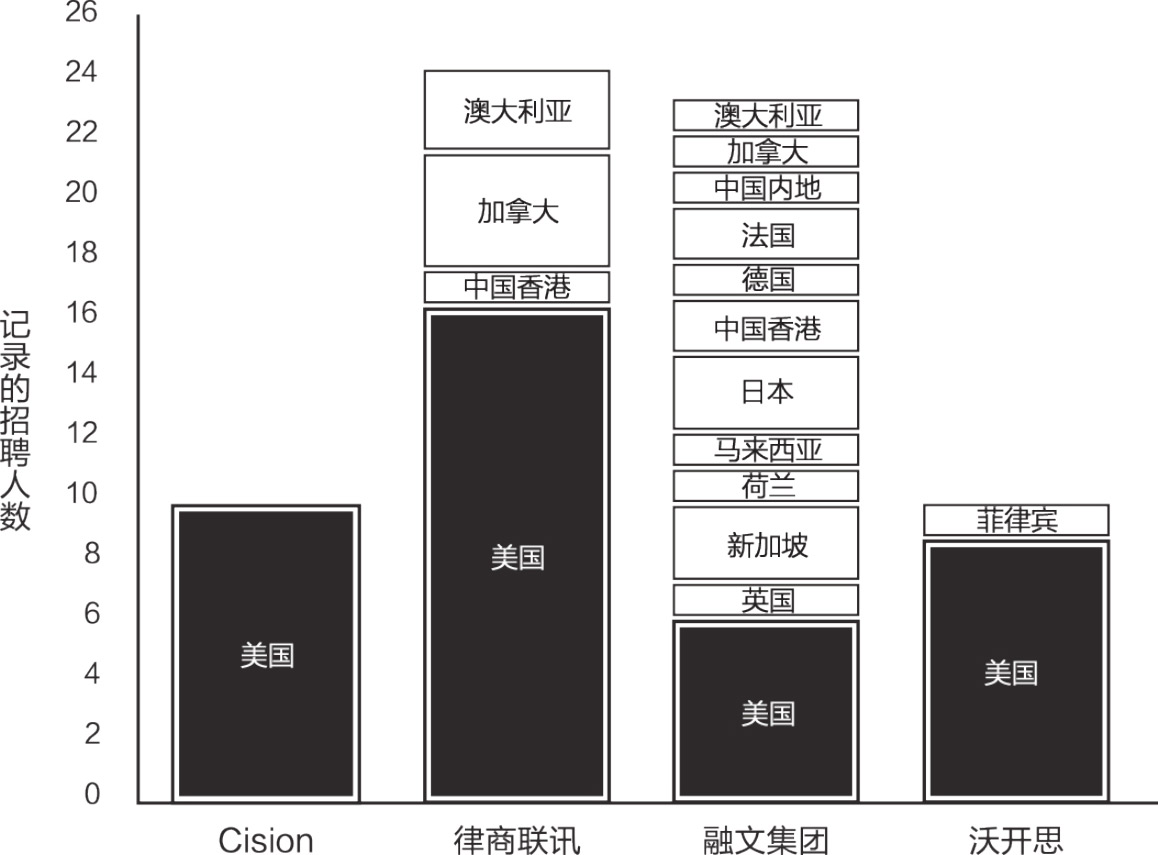 研究4家公司在不同地理区域发布的招聘广告,还能发现它们采用的市场策略迥然不同。Cision只在美国招聘,明显以美国为发展中心。沃开思的大多数招聘广告也面向美国发布,但也有少数面向菲律宾。这让我们大感惊讶。后来我们了解到,沃开思为了削减成本,将某些基础工作外包给了菲律宾。律商联讯有2/3的招聘广告在美国发布,其余的面向澳大利亚、加拿大和中国香港等使用英语的国家和地区。融文集团的招聘模式截然不同。我们在美国招聘的职员最多,同时面向许多其他国家招聘,在澳大利亚、加拿大、中国内地、法国、日本、马来西亚、荷兰、新加坡和英国都发布了招聘广告。从数据中可以清楚地看出,融文集团的运营比同行业其他公司更加全球化(见图1.1)。