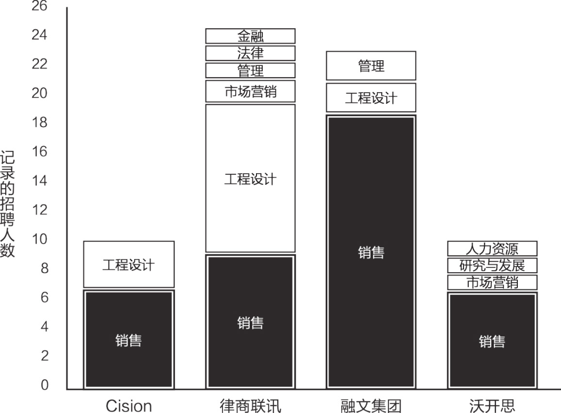 在对招聘广告的研究中,我们发现了一个有趣的新模式。融文集团、沃开思和Cision大部分的招聘岗位是销售和市场营销,分别占各自招聘岗位总数的80%、80%和60%,但律商联讯在这方面比较落后,占比仅有44%。融文集团聚焦于增长的策略一览无余,因为我们发布的招聘销售与营销人才的广告数量,几乎抵得上其他3家公司的总和。而4家公司在工程设计人才上的投入的排名完全相反。律商联讯发布的招聘这类人才的广告数量和其他3家公司的总数相当,这表明它们正在投资开发新产品(见图1.2)。