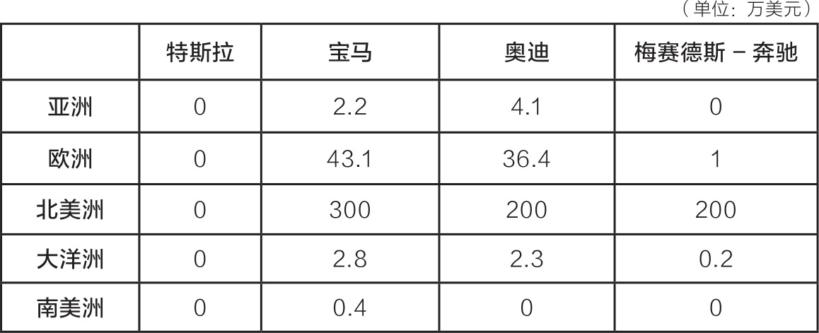 数字面包屑留下的另一条有趣的路径是搜索引擎营销(search engine marketing,SEM)或者所谓的每点击付费(pay-per-click,PPC)支出。因为网络搜索关键词可以实时拍卖,人人都能了解详细的清单和现行价格。市场研究机构eMarketer估计,2015年,搜索支出在总值高达581.2亿美元的数字广告支出的市场中占到了46%的份额,因此搜索支出也是追踪大部分公司时一项很有意思的标准。追踪观察竞争对手的搜索支出及其趋势,并按国家和产品系列来归类,可以提供无比宝贵的竞争洞察。表1.1估算了特斯拉与另外3家同行业竞争对手之间的搜索引擎营销支出,时间截至2016年二季度。值得注意的是,在网络广告方面,特斯拉的支出几乎为0。而宝马在这方面的支出,在各个大洲均超过所有竞争对手。