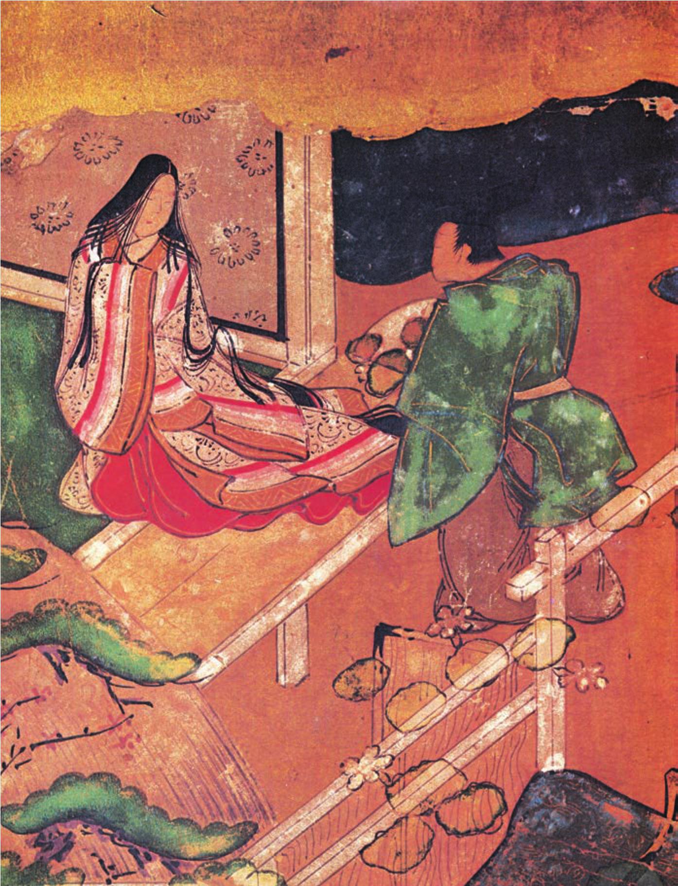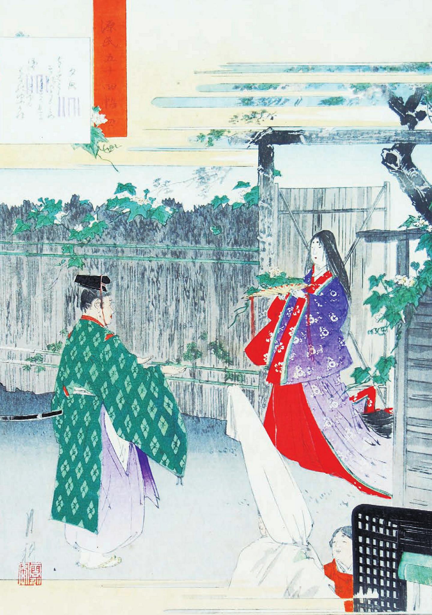 爱情失意的源氏公子,让侍女在角落的房前栏杆边上小坐,端详着她那谨小慎微的举止和美丽的垂肩发,觉得她长得真漂亮,随即脱口而出:“心离名花言谨慎,不摘朝颜将悔恨。”图为源氏公子与侍女相对而坐的情状。