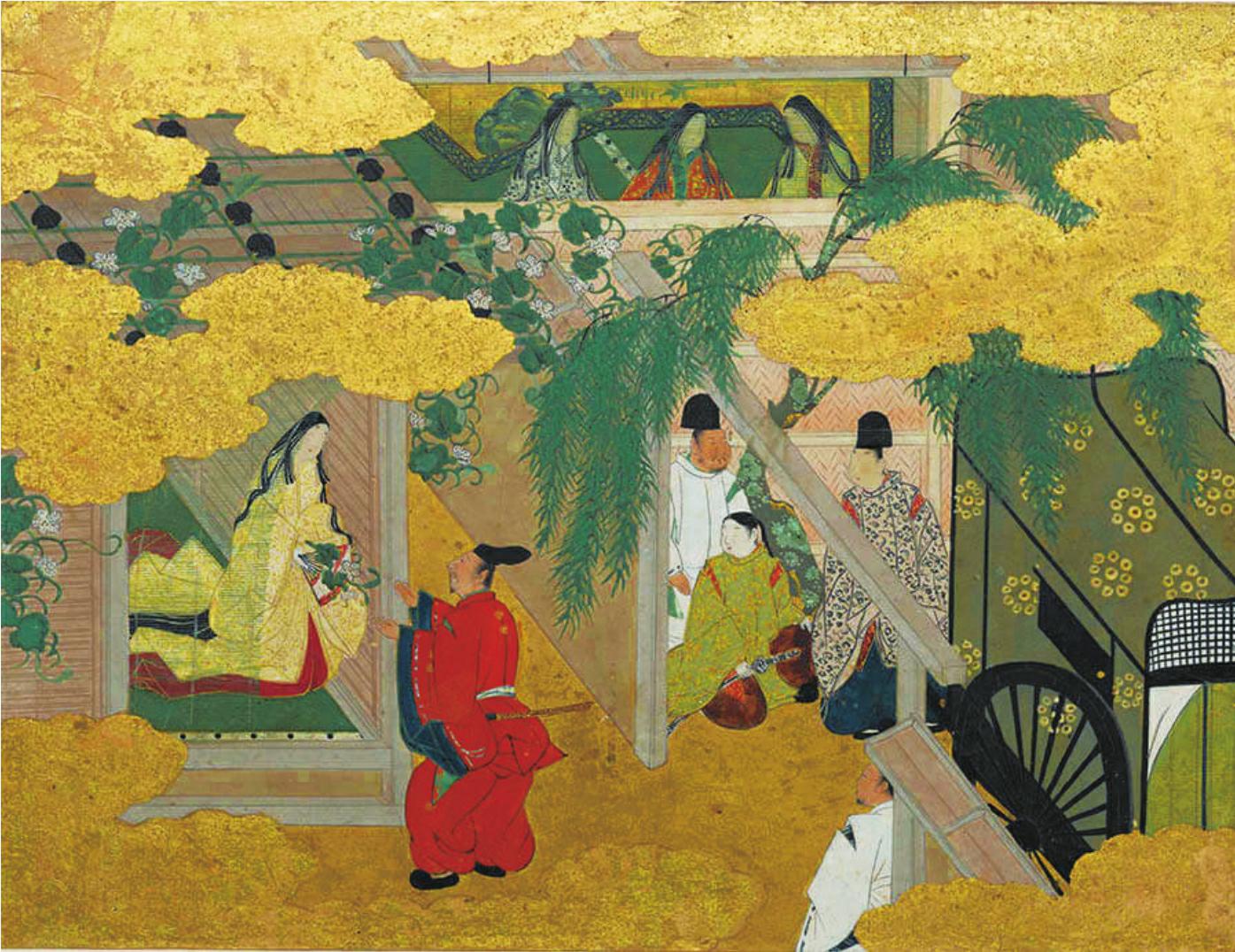 源氏公子来到目的地六条妃子的宅邸,这里的树丛、庭前种植的花草都与别处迥异,住处分外幽雅恬静。六条妃子仪态端庄,品位高雅,气度非凡,绝非一般女子可以比拟。公子到了这里,哪会想起墙根夕颜花之事呢。翌日早上,稍许贪睡了些,及至旭日升起时才起程回府。他那迎着朝阳的姿态,神采奕奕,非常优雅,人们对他赞不绝口是有其道理的。今日归途中,又经过那夕颜花的窗前。往日赴六条时,每每经过此处,却一向不曾在意,只因区区扇面上的题歌,竟拨动公子的心弦。他寻思:“这里面住的是什么样的人家呢?”此后,往来路过此处,必定注目察看。