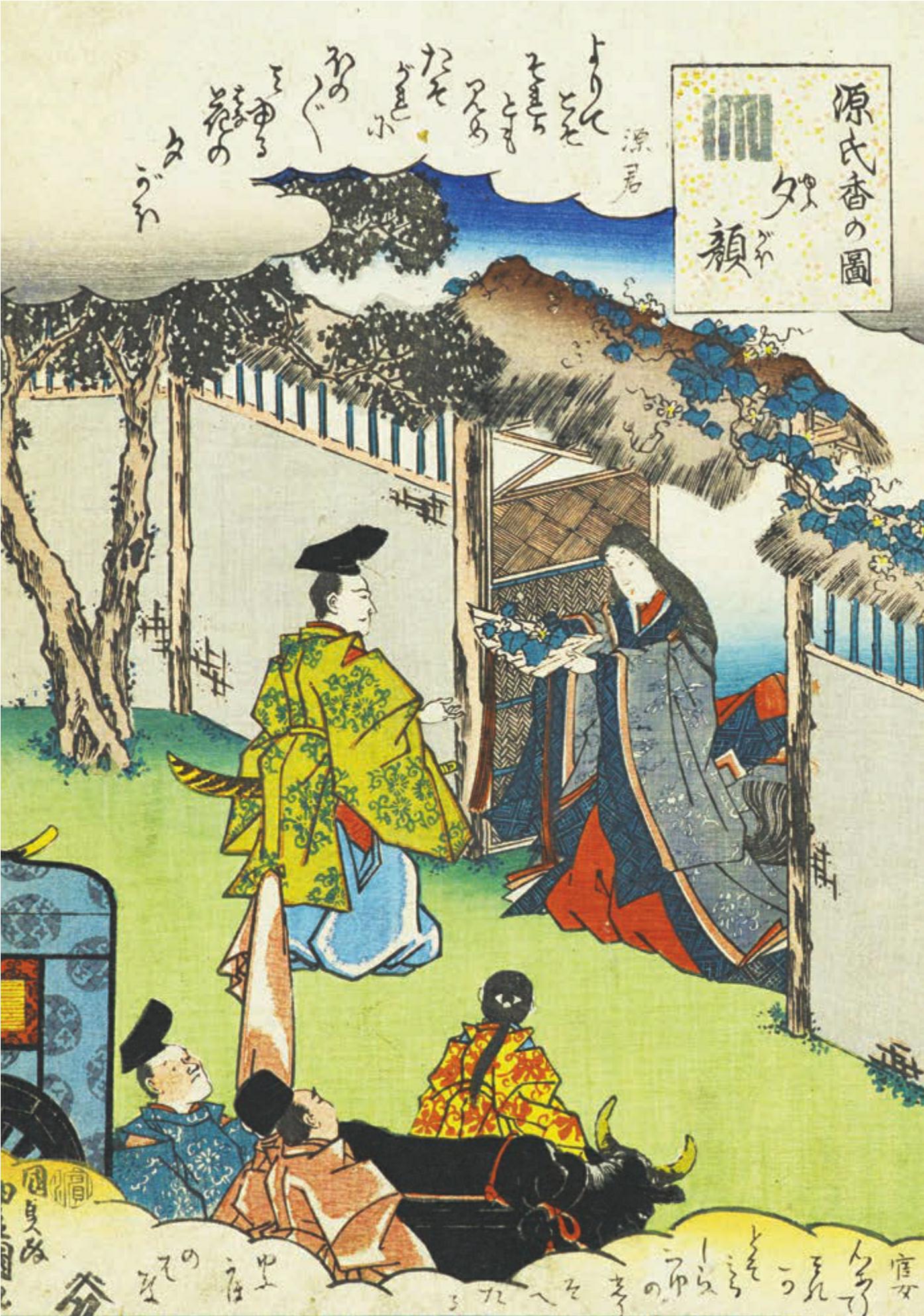 ,这花名似人名,这种花都是在这种奇异的墙根边上开放的。”的确,这一带到处是一间间又小又破的旧房屋,东倒西歪,四周环境脏兮兮的,这种蔓草就在这样十分寒碜的人家的屋檐下四处开花。源氏公子目睹此种情景,说:“这是可怜的薄命花啊!给我摘一朵来。”随从就从敞开着的门走了进去,正在摘花之时,只见一个身穿单层黄色薄纱和服长裙的可爱女童,从一扇雅致的拉门里走了出来,并向随从招手。她手里拿着一把薰香扑鼻的白扇子,说道:“请将花放在扇子上献上吧。因为这是没有花枝也没有情趣的花。”说着,将扇子递给了随从。恰巧这时,惟光出来开大门,随从就把盛着花的扇子交给惟光,由他献给了源氏公子。惟光惶恐地致歉说:“因为忘却钥匙放在哪里了,迟迟才来开门,这是万不应该的事,虽然这种地方不会有见过世面的人,不过让各位在杂乱无章的大街上久候,实在是……”于是,将车子赶进门内,源氏公子便下车。
