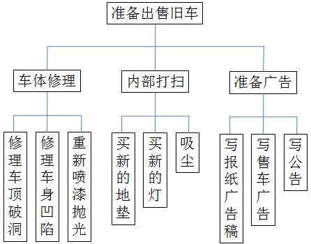 以“卖旧车前的准备工作”为例,先罗列出计划要做的工作:修理车顶的破洞、买新的车内地毯、写报纸广告稿、买新的顶灯、修理车身凹陷处、把锈斑喷漆、写后窗售车广告、写公告板的售车海报、将车内吸尘;然后再用MECE分类法进行整理(如图2.6所示),感觉是不是更加清晰明确了呢?
