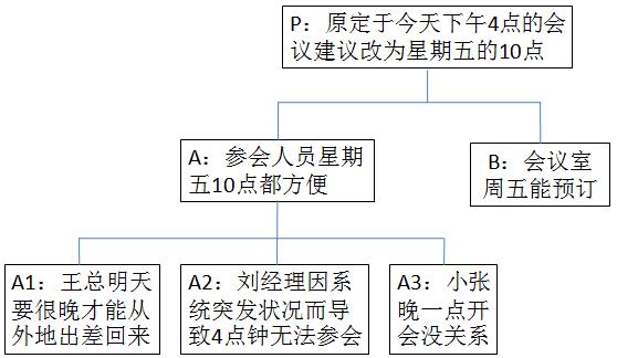 首先,在“因此”一词后面识别出结论为“原定于今天下午4点的会议建议改为星期五的10点”;然后将筛选出的理由分成两类,一类是与人有关的理由,即“参会人员星期五上午10点都方便”,一类是与会议室有关的理由,即“会议室周五还能预订到”;最后再寻找对应理由的事实,全部与参会人员相关,包括“王总明天需要很晚才能从外地出差回来”、“刘经理因系统突发状况而导致4点钟无法参加会议”和“小张晚一点开会没关系”。