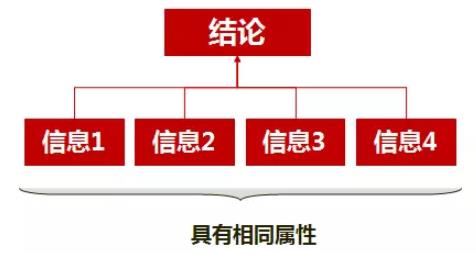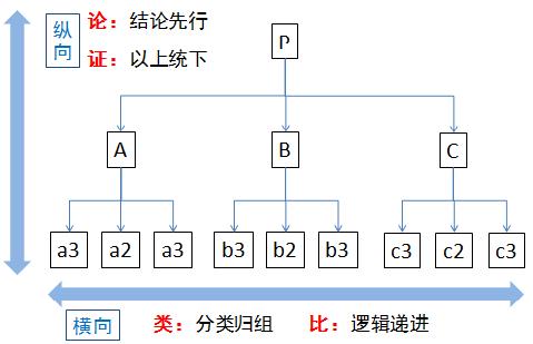 在金字塔结构中,纵向层次之间通常是“总-分”或“果-因”关系,横向元素之间通常把同类归并为一组,各组之间呈并列关系。