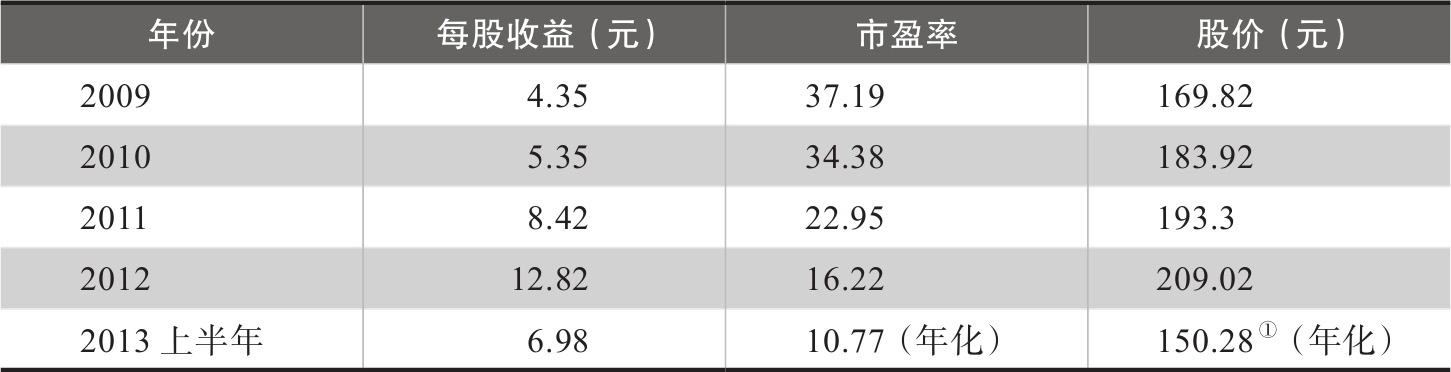 可以清晰地看到2009~2013年上半年,贵州茅台的每股收益增加近2倍,股价下跌近20元,市盈率从30多倍降到了10倍。这组数据非常值得思考和重视,业绩增长(每股收益)、股价下跌,估值水平(市盈率)下跌。表1-8非常清晰地反映了一个事实,贵州茅台的股价对基本面业绩的增长没有任何反应。写到这里,我必须做个自我检讨,如果一个公司不断成长,它的股价却不断下跌,此时投资者应该感到高兴,而不应该把这种现象视为不正常。很显然我尚未达到这种境界。