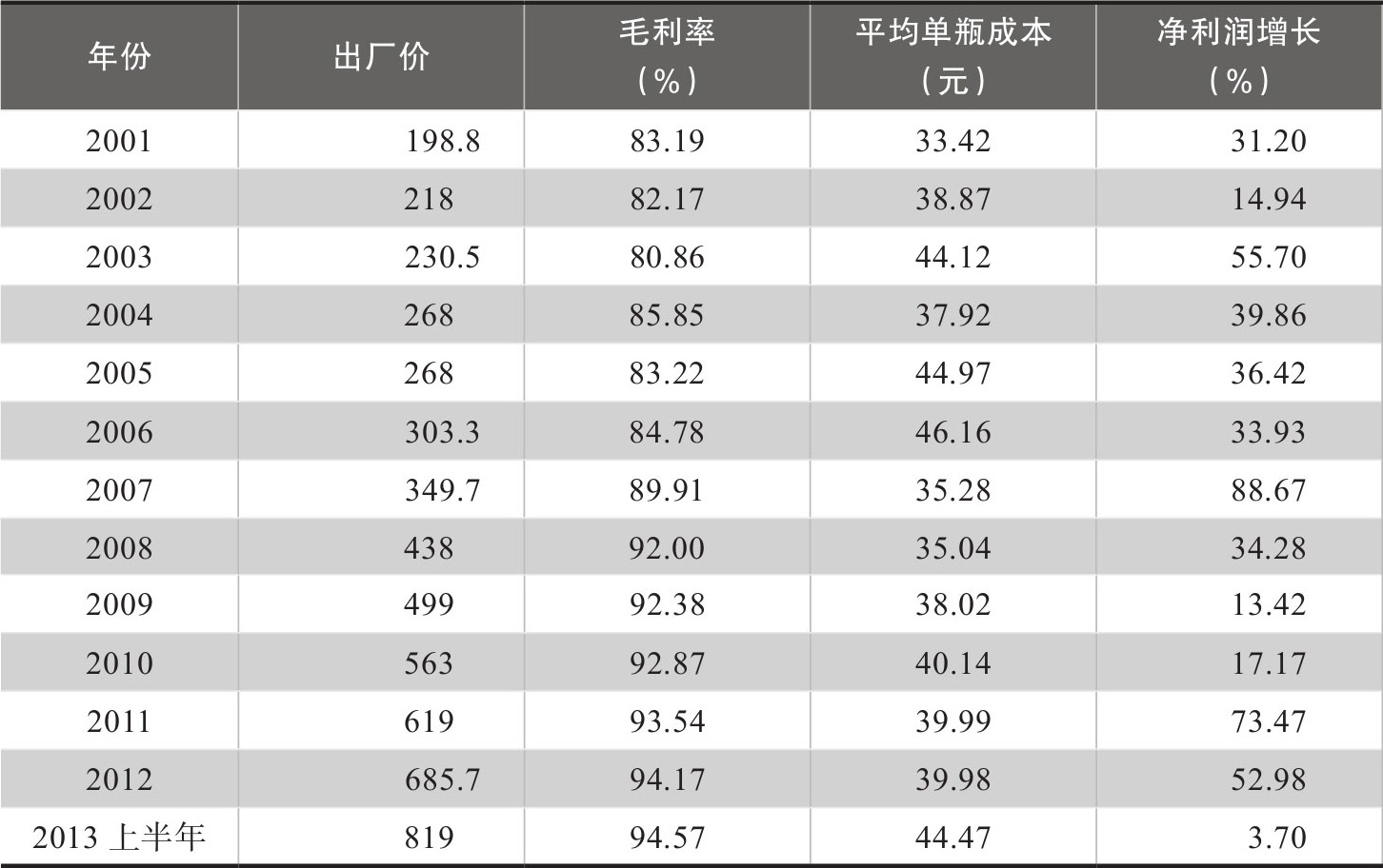 贵州茅台的业绩增长本身是有周期性的。当然,这种周期不是普遍意义上的经济周期。2003~2013年,贵州茅台除了2013年第二季度从没有负增长过,它的最低成长速度接近10%,最高成长速度超过50%。由此可见,贵州茅台不是一个普通的消费品企业,贵州茅台酒不是日用消费品,而是一种高级的精神文化产品。这种需求与经济周期有内在关联,从而使贵州茅台的成长具有周期性,而且波动比较大。我们必须承认这一点。
