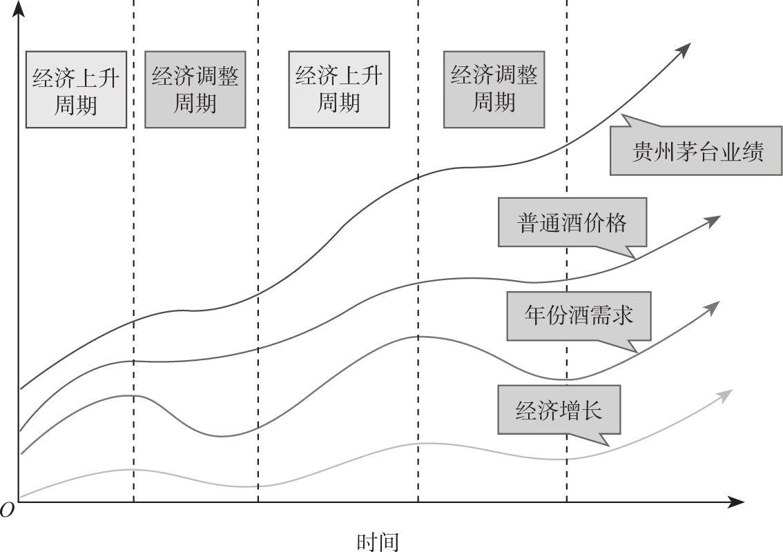 贵州茅台酒价格、需求走势和经济的关系如图1-8所示。