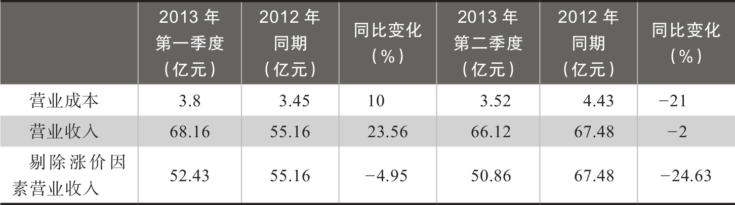 以上两组背景数据是为解读贵州茅台2013年半年报做基础的,现在我们查看其2013年半年报披露的营业成本和营业收入(除系列酒),如表1-6所示。