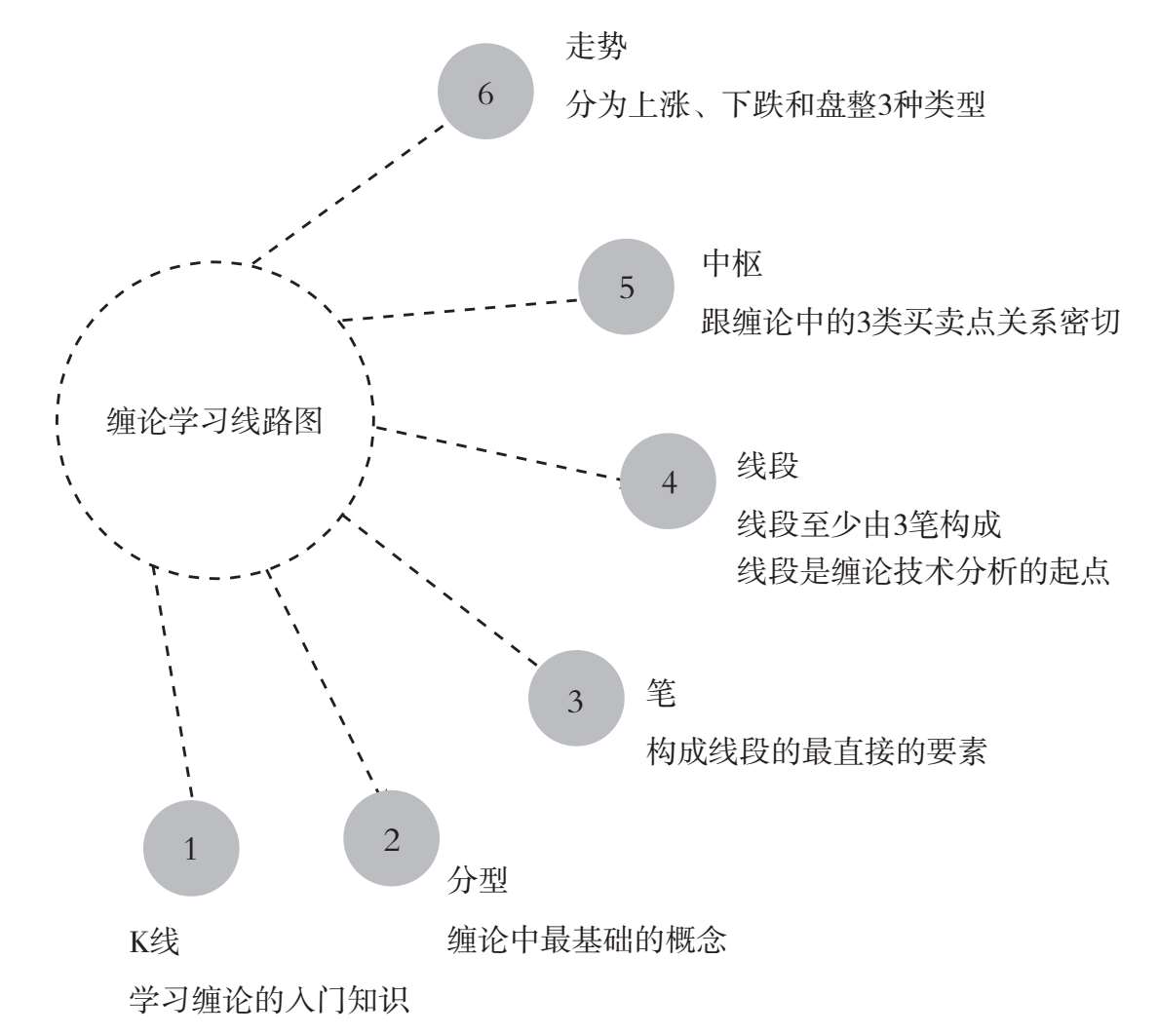 为了方便人们学习和掌握缠论,缠中说禅给出了一条“懒人路线”,人们按照这条路线学习,便可以掌握缠论中的基础概念,具体路线如图2-1所示。