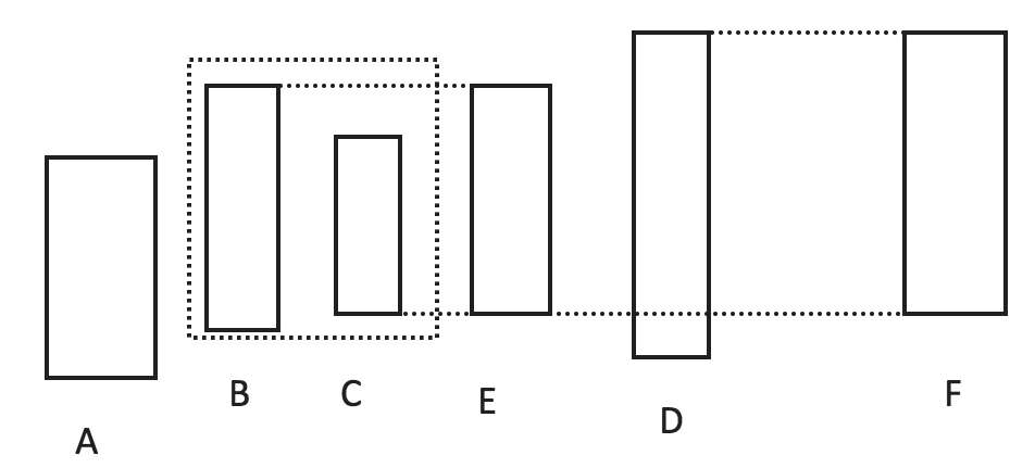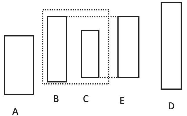 图2-11中,K线B与K线C、K线C与K线D都为包含关系,但是在处理包含关系时,要按照时间顺序来处理,即先处理K线B与K线C间的包含关系,将两条K线合并为新的K线E,然后判断K线D与K线E之间是否存在包含关系,如果存在,则继续处理;如果不存在,则无须处理。