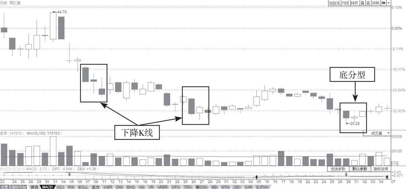 图2-6 同仁堂日K线图中的下降K线和底分型