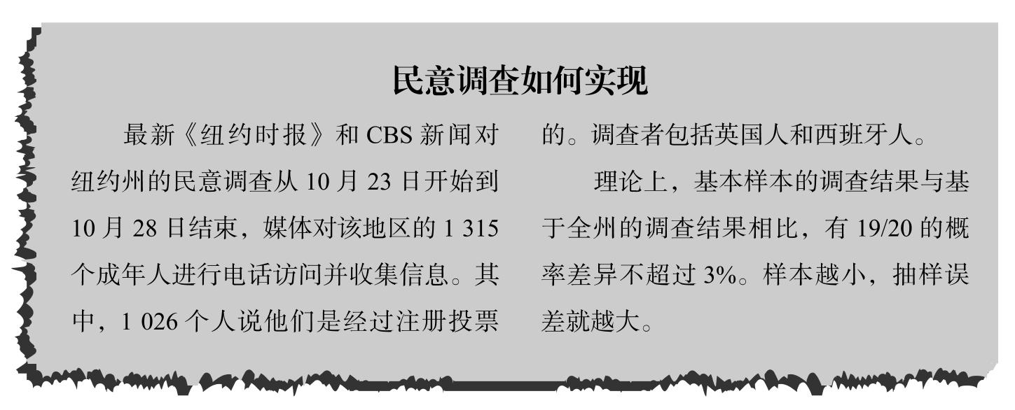 统计科学提供了一种方法,使得调查者能够确定样本统计量可以很好地估计总体参数。例如,调查或投票结果经常涉及误差幅度的概念。通过加减误差幅度,可以得到样本统计量的区间(即置信区间),它很可能包含总体参数。在大多数情况下,误差幅度被定义为该范围包含总体参数的置信度为95%。我们将在第八章讨论有关“可能”和“95%置信度”的精确定义。《纽约时报》( The New York Times )上有一个十分有用的解释(如图1-1所示)。在尼尔森案例中,误差幅度是1%。因此,如果样本中31%的人观看超级碗橄榄球比赛,那么总体中有30%~32%的人观看超级碗比赛的这个结论有95%的置信度。
