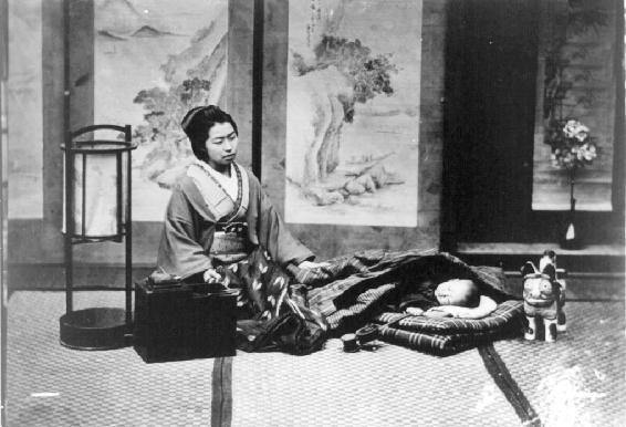 日本人对于分娩的态度十分隐秘,一个产妇不能在阵痛的时候大声呻吟。母亲要在孩子出生之前准备好新被褥和小床,据说新出生的婴儿没有新床睡便是不吉利。一些贫苦家庭没钱买新床,只好把被料和棉花重新洗净,作成“新”被。这些给婴儿用的小被褥并不像大人的那样结实,都非常轻。日本人还有一种说法是婴儿在自己的床上才会睡得更香。父母在心灵深处之所以愿意与婴儿分床睡,是因为新人应该睡在“新”床上的观念使然,虽然婴儿的床就在母亲的床旁边,但只有婴儿自己要求与母亲同睡时,他才会被允许与母亲睡在一起。而婴儿大概在一周岁时才会伸出双手提出这样的要求。直到这个时候,母亲才会搂着婴儿睡。
