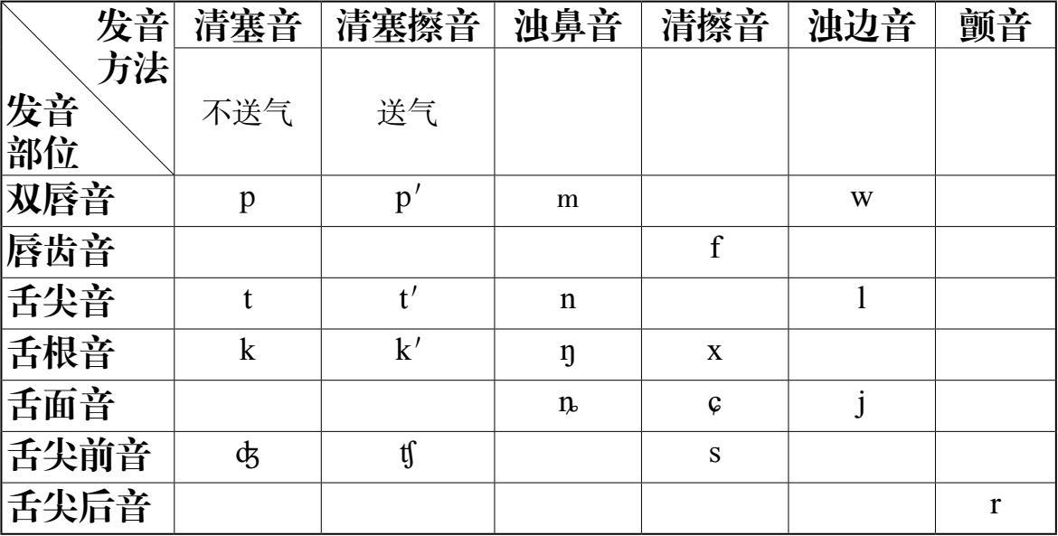 辅音有p、p'、m、f、t、t'、n、l、k、k'、x、r、ʤ、ʧ、s、ɕ、 ȵ、j、w、ŋ,共计20个。