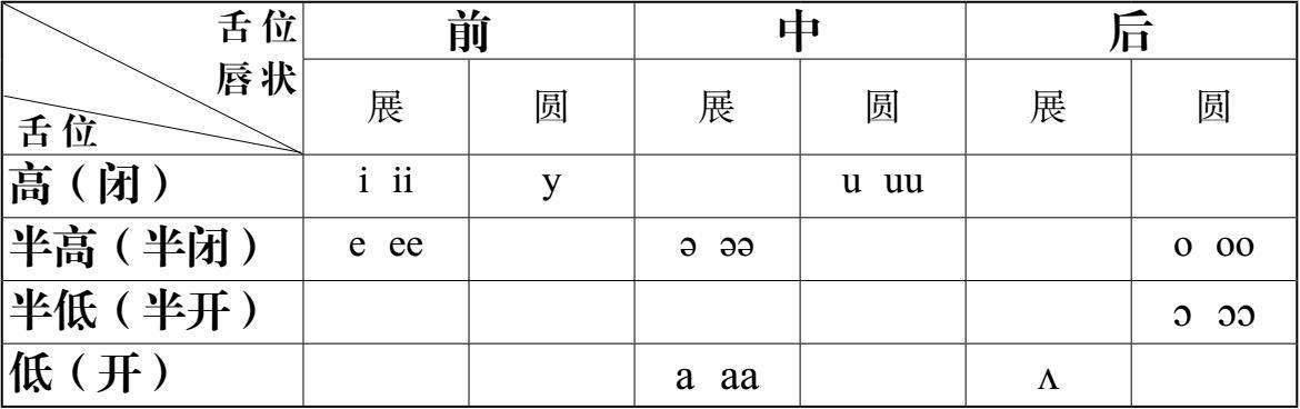 元音由于发音时唇形圆展不同,可分为展唇元音和圆唇元音。展唇元音有:a、ə、e、i、ʌ,圆唇元音有:ɔ、o、u、y。