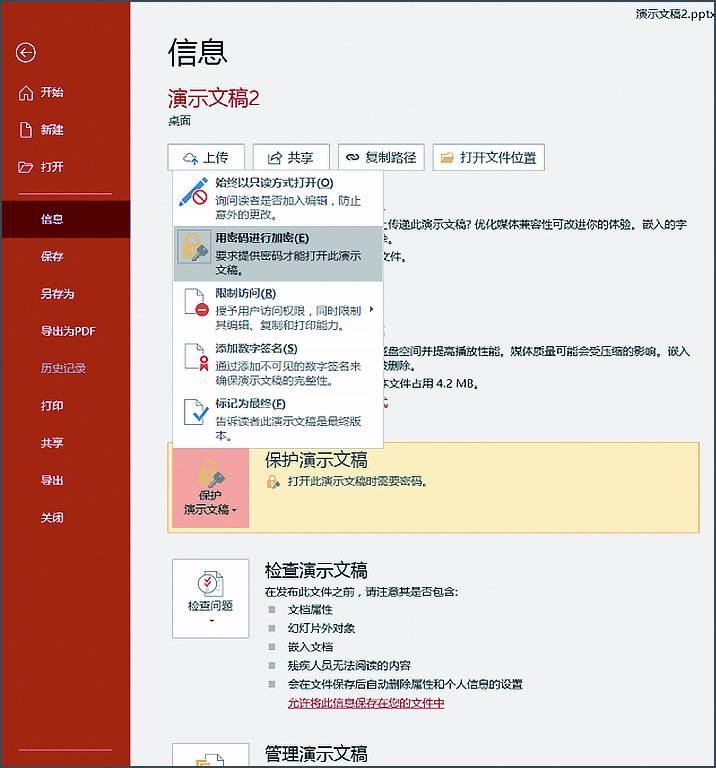 如果PPT的内容涉及公司或个人机密,为了防止他人查看,我们可以为演示文稿文件设置密码,进行加密保护。