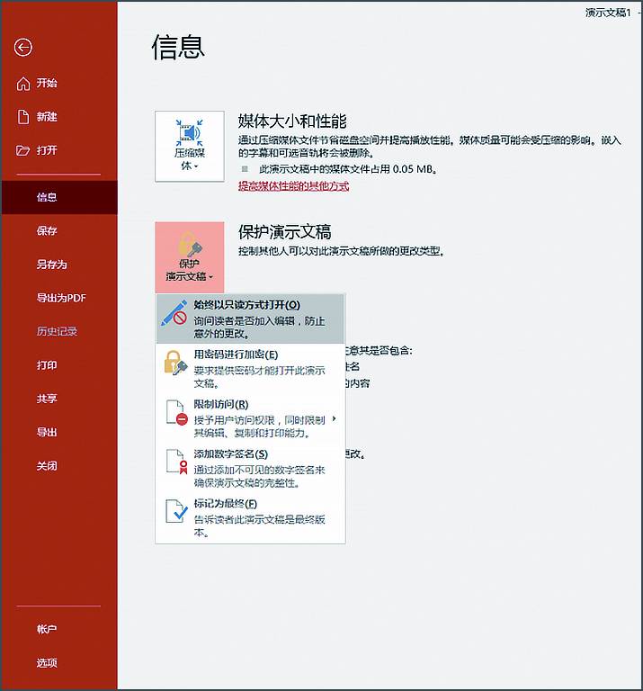 (1)点击“文件”选项卡,选择“信息”命令,点击“保护演示文稿”的下拉选项,在展开的选项中选择“始终以只读方式打开”,如图1.5-8所示。