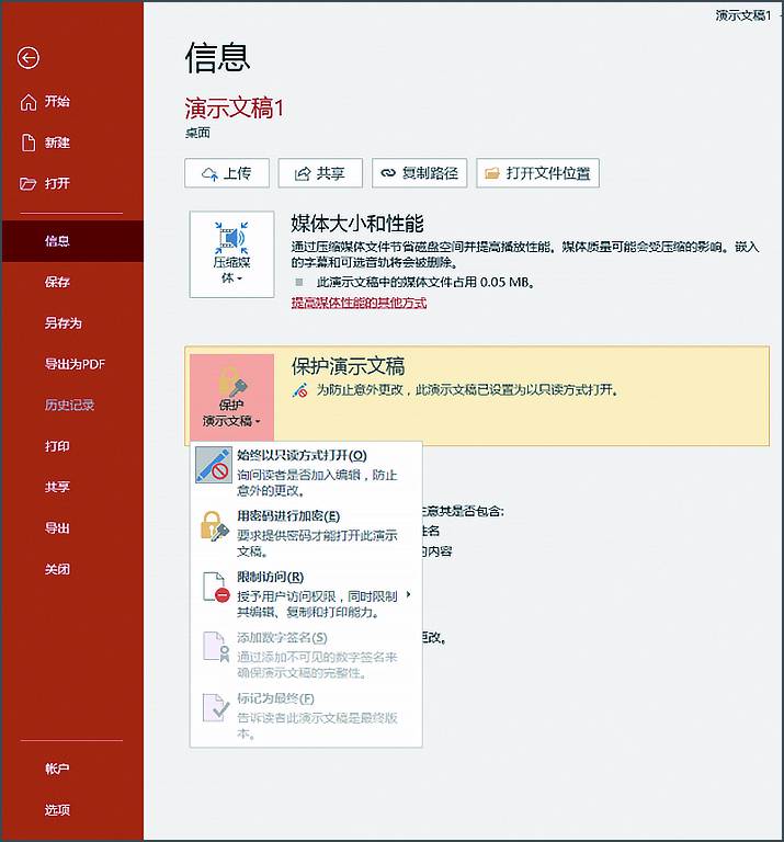 只读模式也叫最终模式,意思是只能查看内容,不能修改内容。在一些情况下,我们需要将PPT设置为只读模式,以防止误改。设置只读模式十分简单,与PPT加密一样,都在“保护演示文稿”这一选项中。