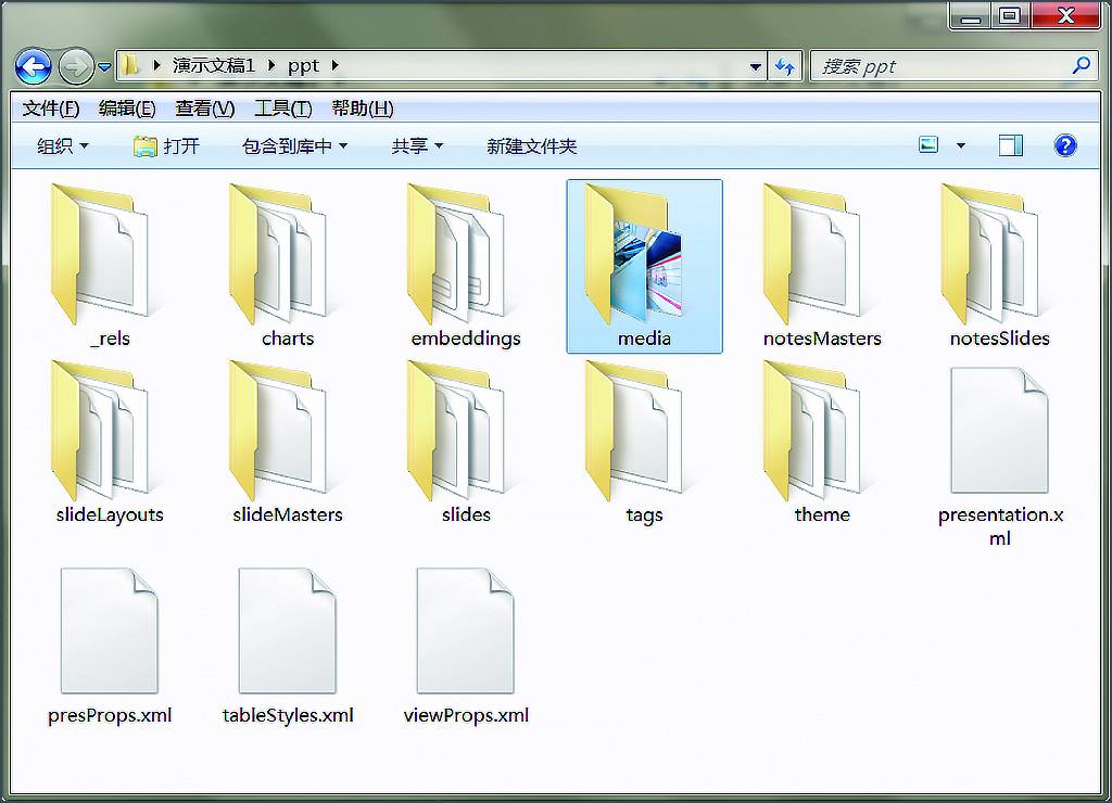 改完后缀名之后,再对zip文件进行解压,在解压好的文件夹中,选择“PPT”→“MEDIA”就能够看到PPT中的所有图片/视频/音频文件了,如图1.5-13所示。