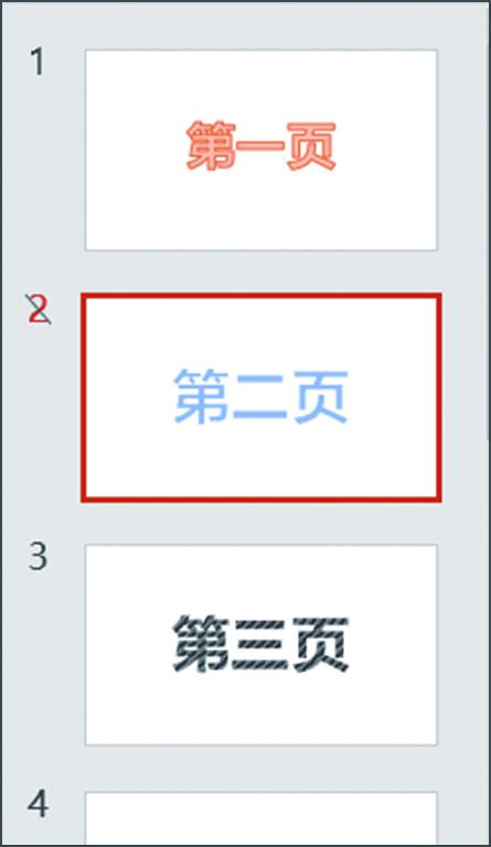 还有一个确认该页幻灯片是否被隐藏的方法,那就是看幻灯片预览区,如图1.5-15所示,隐藏的幻灯片左上角的页码显示被划掉了,这就能够确定该页幻灯片已经隐藏了。