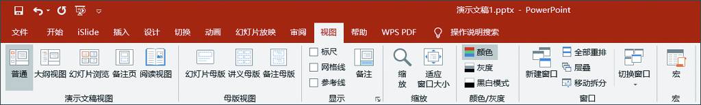 在PowerPoint中,用户可以根据自己的使用习惯来选择辅助功能,例如标尺、参考线或网格线等,通过这些辅助功能来制作PPT,一是排版更加方便,二是节省了将各种元素分别进行对齐的时间。打开“视图”选项卡,我们能够看到调整幻灯片视图的“演示文稿视图”选项卡,如图1.5-17所示,该选项卡中的选项比状态栏中的要多,这里不再一一叙述,感兴趣的话,就去试试吧!