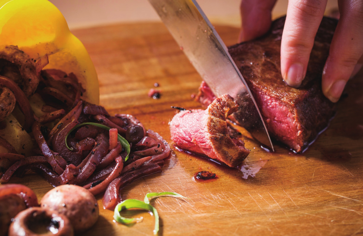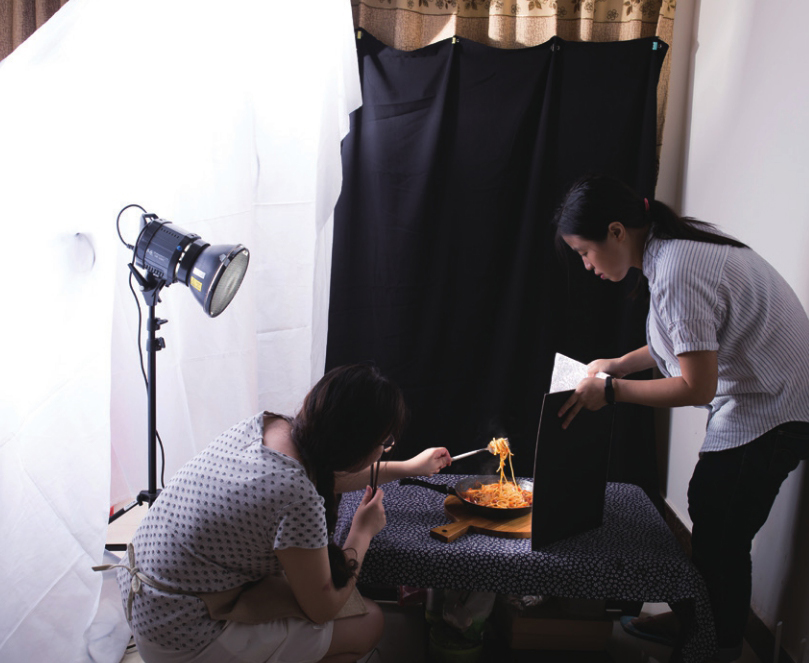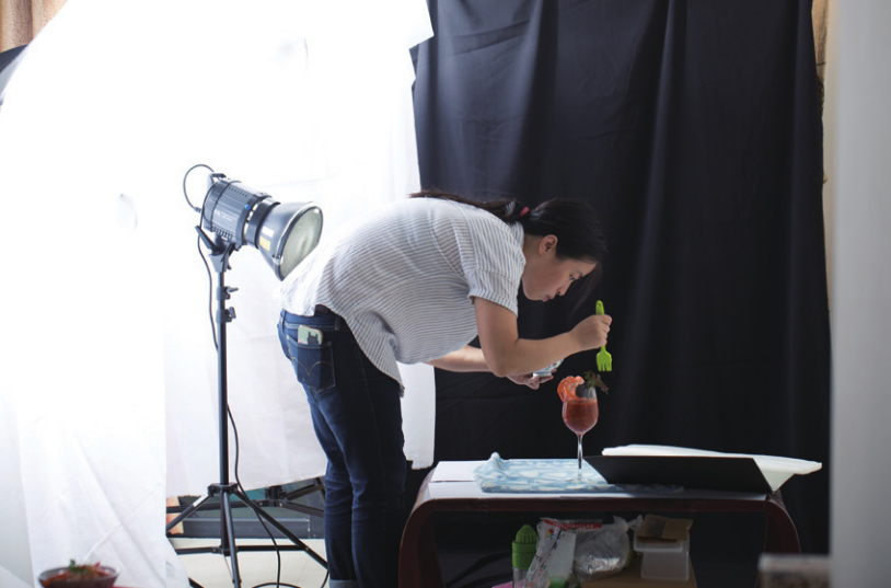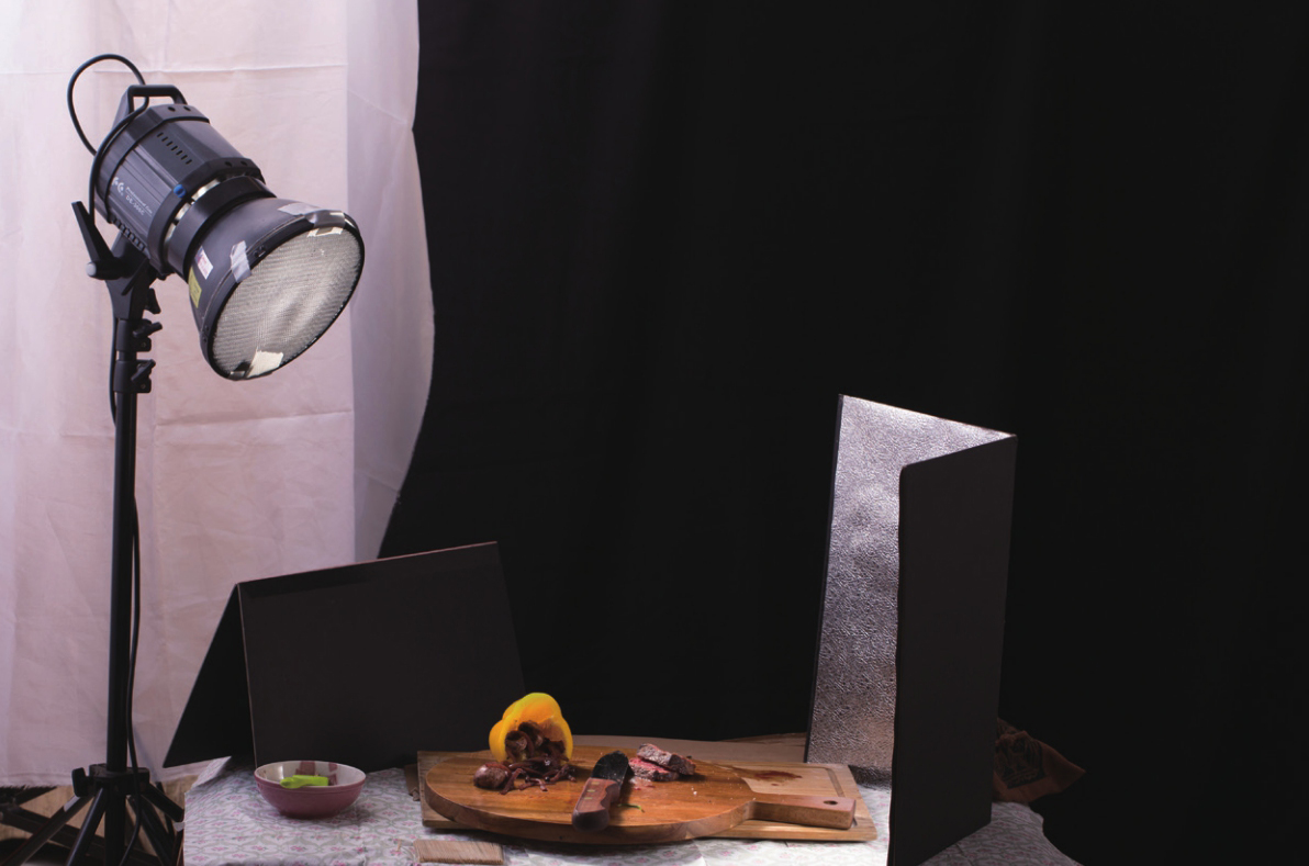 15 拍摄一张人手入镜,做出切牛扒动作的图片。但人的身体遮挡了蜂巢灯的光线,因此,把它移到左后侧。