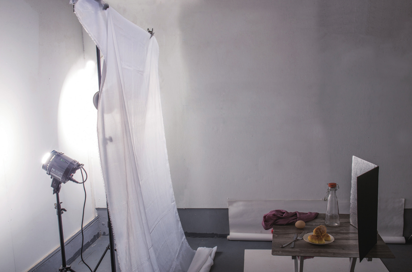 于是我利用白色的墙面进行反光,再在反射的光线与面包之间拉上一层白色的柔光布,就形成了落地窗的光感。